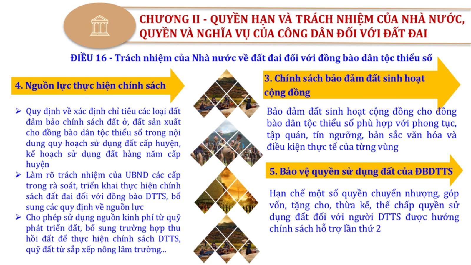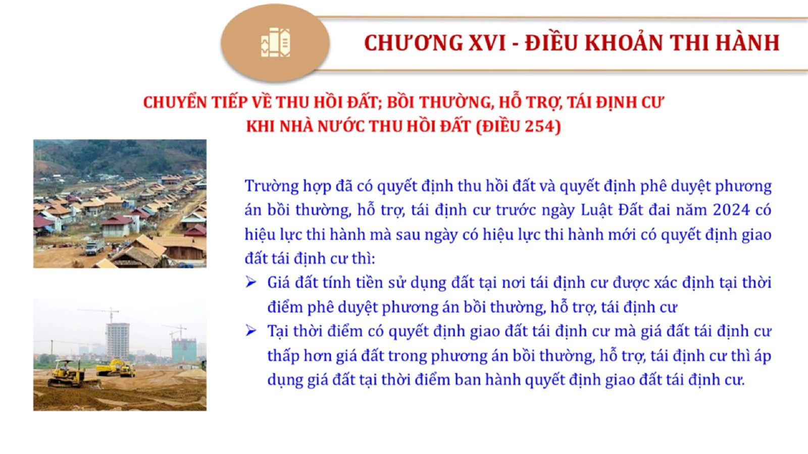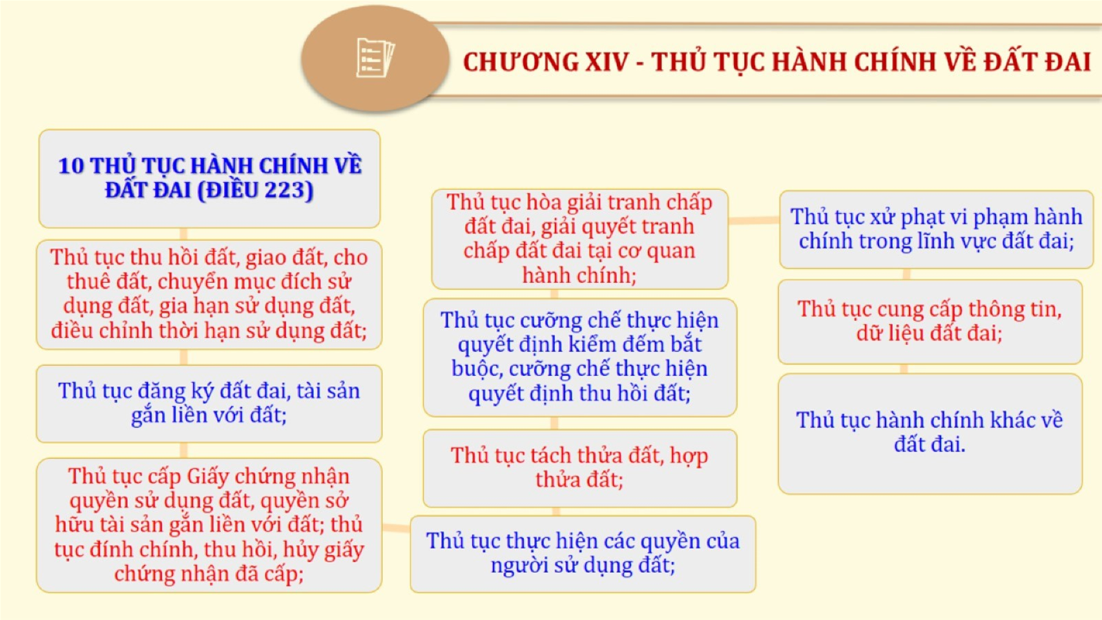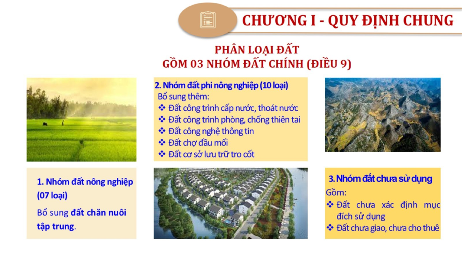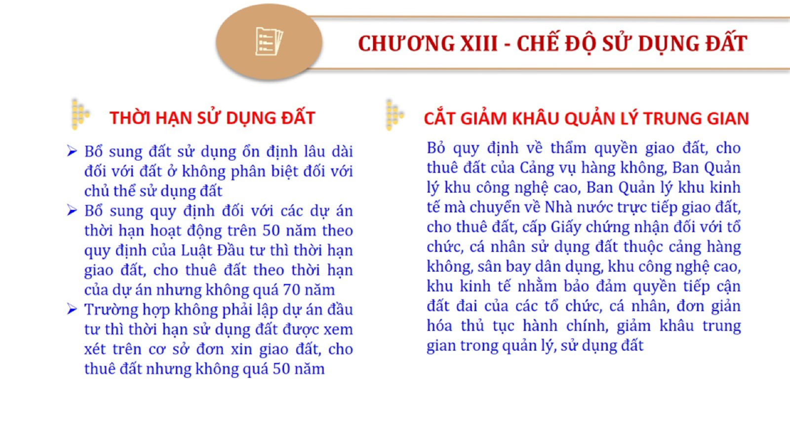 Từ lịch sử xây dựng và hoàn thiện Luật Đất đai từ năm 1998 đến năm 2024, Luật Đất đai đã trải qua 09 lần sửa đổi và bổ sung; Cơ sở xây dựng Luật Đất đai năm 2024 với hai cơ sơ chính là cơ sở chính trị và có sở thực tiễn; Quan điểm xây dựng Luật Đất đai năm 2024 với 06 nội dung lớn. Cụ thể: Một là, thể chế hóa đầy đủ, kịp thời các quan điểm, chủ trương của Đảng tại Nghị quyết Đại hội lần thứ XIII của Đảng, Nghị quyết số 18-NQ/TW và các nghị quyết, kết luận của Đảng về quản lý và sử dụng đất đai; hai là, đảm bảo kế thừa, ổn định, phát triển của hệ thống pháp luật đất đai; sửa đổi, bổ sung các quy định chưa phù hợp với thực tiễn; ba là, đảm bảo đồng bộ, thống nhất của hệ thống pháp luật về đất đai với các pháp luật có liên quan; hoàn thiện các chế định để quản lý đất đai theo chức năng là tài nguyên, tài sản, nguồn lực cả về diện tích, chất lượng, không gian sử dụng; bốn là tiếp tục đẩy mạnh phân cấp, phân quyền đồng thời thiết lập công cụ kiểm soát quyền lực của cơ quan và người có thẩm quyền trong quản lý đất đai. Tăng cường vai trò giám sát của Quốc hội, Hội đồng nhân dân, Mặt trận Tổ quốc Việt Nam, tổ chức chính trị - xã hội các cấp và Nhân dân; năm là, đẩy mạnh cải cách thủ tục hành chính; chuyển trọng tâm từ quản lý bằng các công cụ hành chính sang sử dụng hiệu quả các công cụ kinh tế để thúc đẩy sử dụng đất hợp lý, hiệu quả, bền vững; sáu là, hiện đại hóa, chuyển đổi số công tác quản lý đất đai dựa trên hệ thống thông tin, dữ liệu đất đai thống nhất, tập trung, phục vụ đa mục tiêu kết nối từ Trung ương đến địa phương, quản lý biến động đến từng thửa đất.