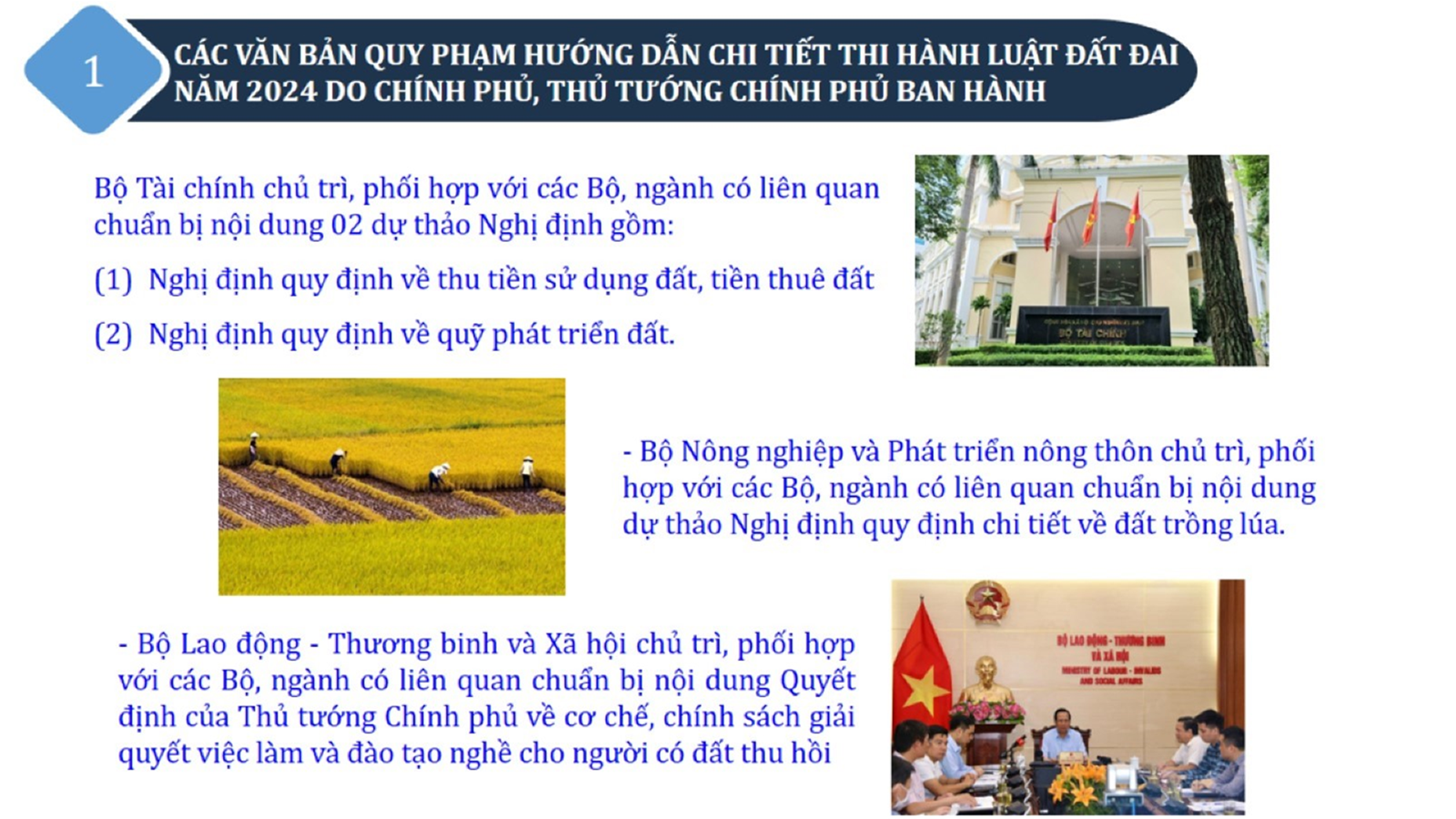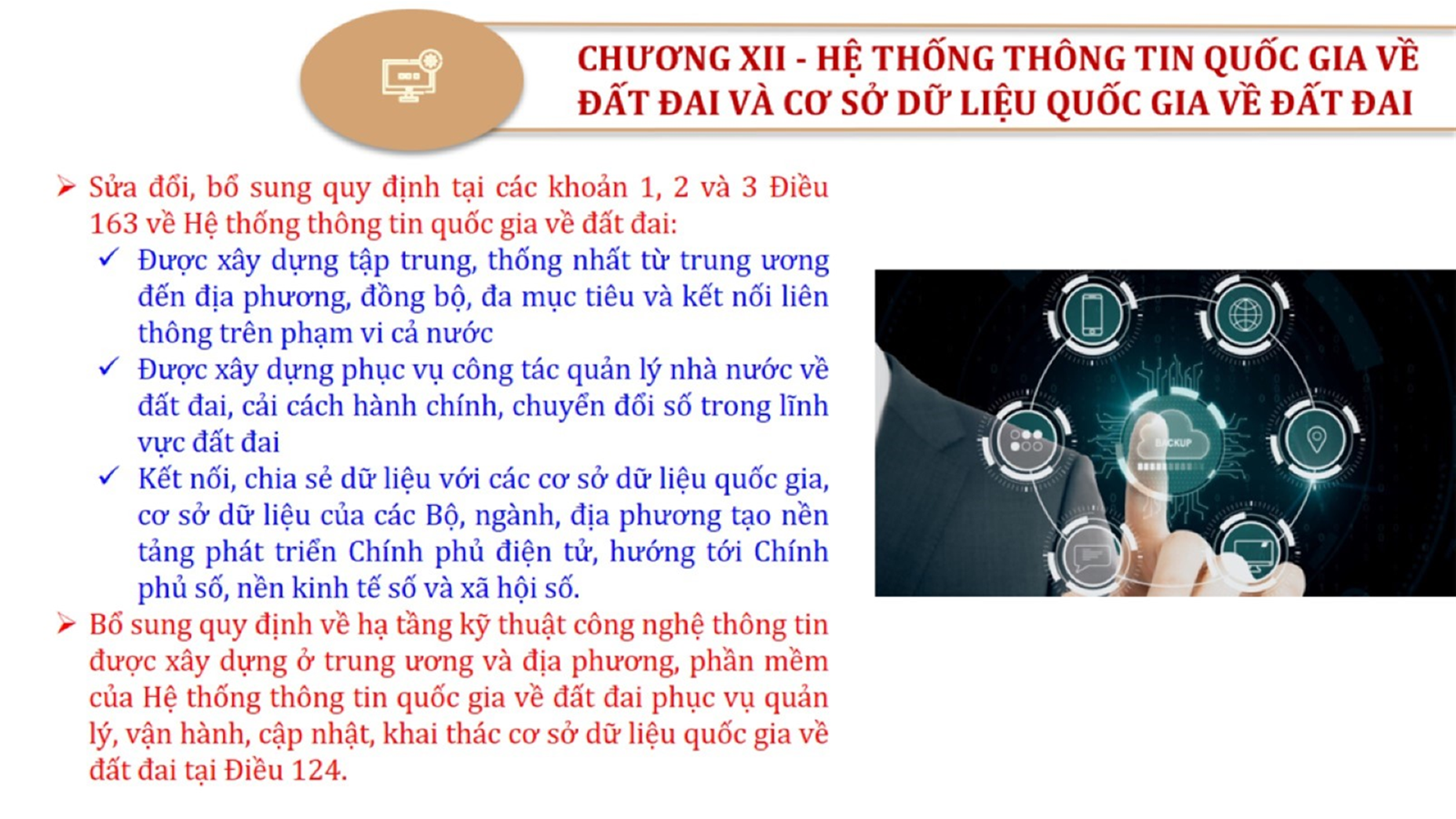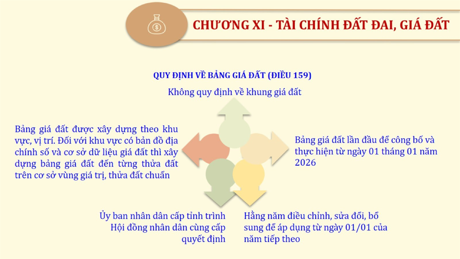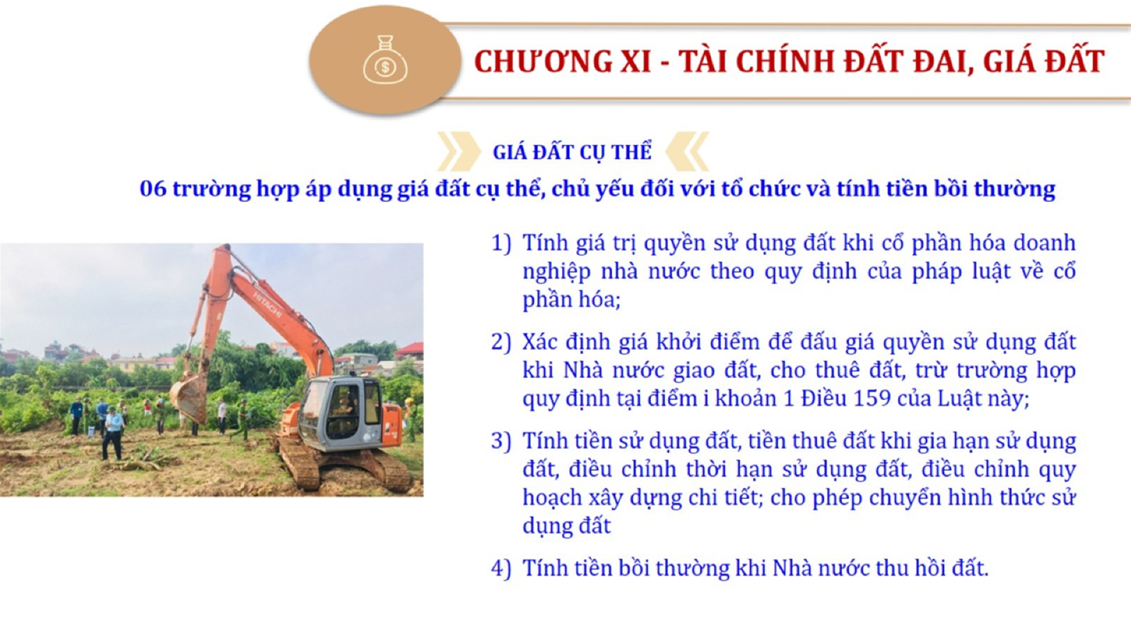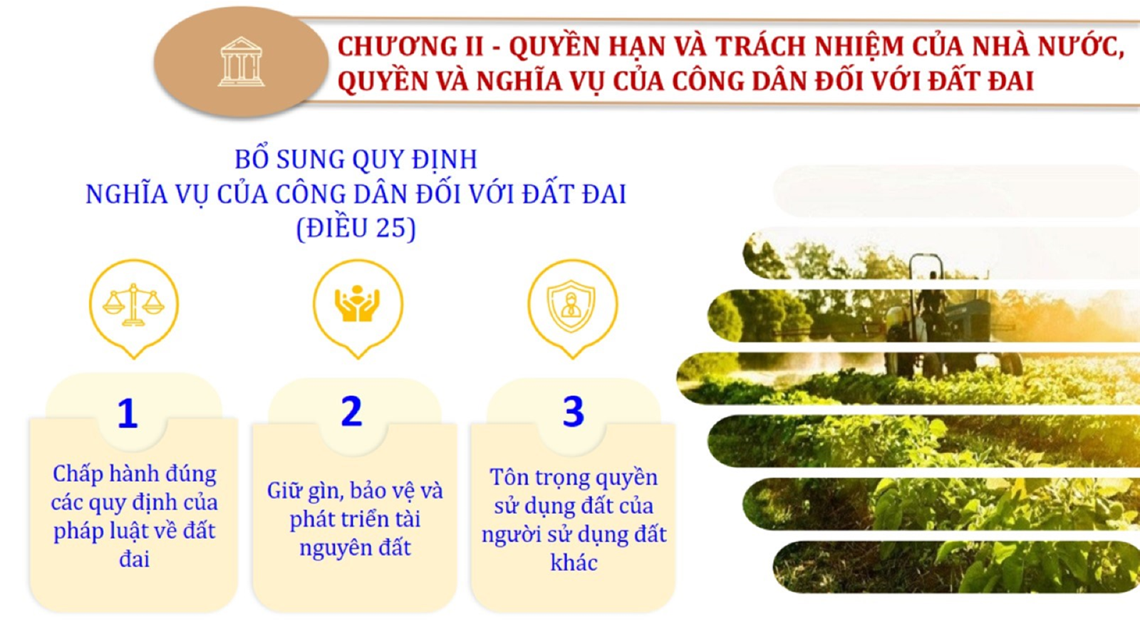 Từ lịch sử xây dựng và hoàn thiện Luật Đất đai từ năm 1998 đến năm 2024, Luật Đất đai đã trải qua 09 lần sửa đổi và bổ sung; Cơ sở xây dựng Luật Đất đai năm 2024 với hai cơ sơ chính là cơ sở chính trị và có sở thực tiễn; Quan điểm xây dựng Luật Đất đai năm 2024 với 06 nội dung lớn. Cụ thể: Một là, thể chế hóa đầy đủ, kịp thời các quan điểm, chủ trương của Đảng tại Nghị quyết Đại hội lần thứ XIII của Đảng, Nghị quyết số 18-NQ/TW và các nghị quyết, kết luận của Đảng về quản lý và sử dụng đất đai; hai là, đảm bảo kế thừa, ổn định, phát triển của hệ thống pháp luật đất đai; sửa đổi, bổ sung các quy định chưa phù hợp với thực tiễn; ba là, đảm bảo đồng bộ, thống nhất của hệ thống pháp luật về đất đai với các pháp luật có liên quan; hoàn thiện các chế định để quản lý đất đai theo chức năng là tài nguyên, tài sản, nguồn lực cả về diện tích, chất lượng, không gian sử dụng; bốn là tiếp tục đẩy mạnh phân cấp, phân quyền đồng thời thiết lập công cụ kiểm soát quyền lực của cơ quan và người có thẩm quyền trong quản lý đất đai. Tăng cường vai trò giám sát của Quốc hội, Hội đồng nhân dân, Mặt trận Tổ quốc Việt Nam, tổ chức chính trị - xã hội các cấp và Nhân dân; năm là, đẩy mạnh cải cách thủ tục hành chính; chuyển trọng tâm từ quản lý bằng các công cụ hành chính sang sử dụng hiệu quả các công cụ kinh tế để thúc đẩy sử dụng đất hợp lý, hiệu quả, bền vững; sáu là, hiện đại hóa, chuyển đổi số công tác quản lý đất đai dựa trên hệ thống thông tin, dữ liệu đất đai thống nhất, tập trung, phục vụ đa mục tiêu kết nối từ Trung ương đến địa phương, quản lý biến động đến từng thửa đất.