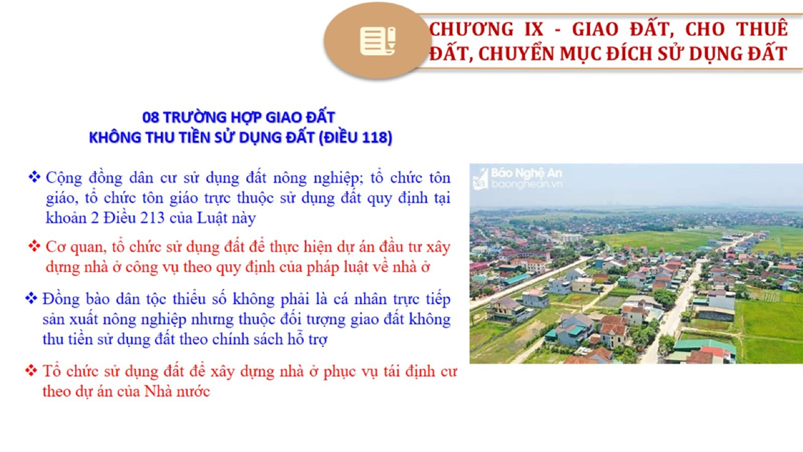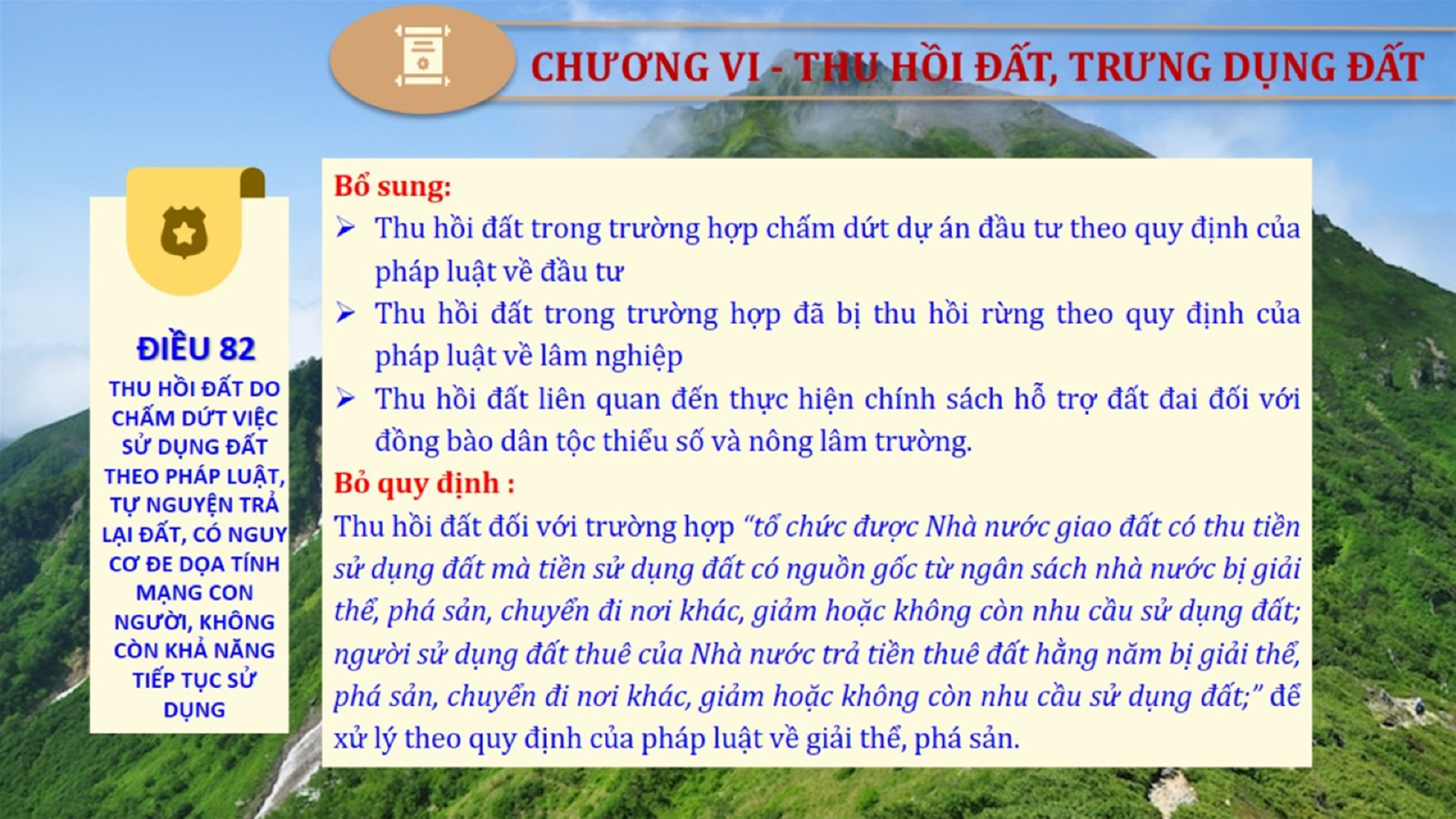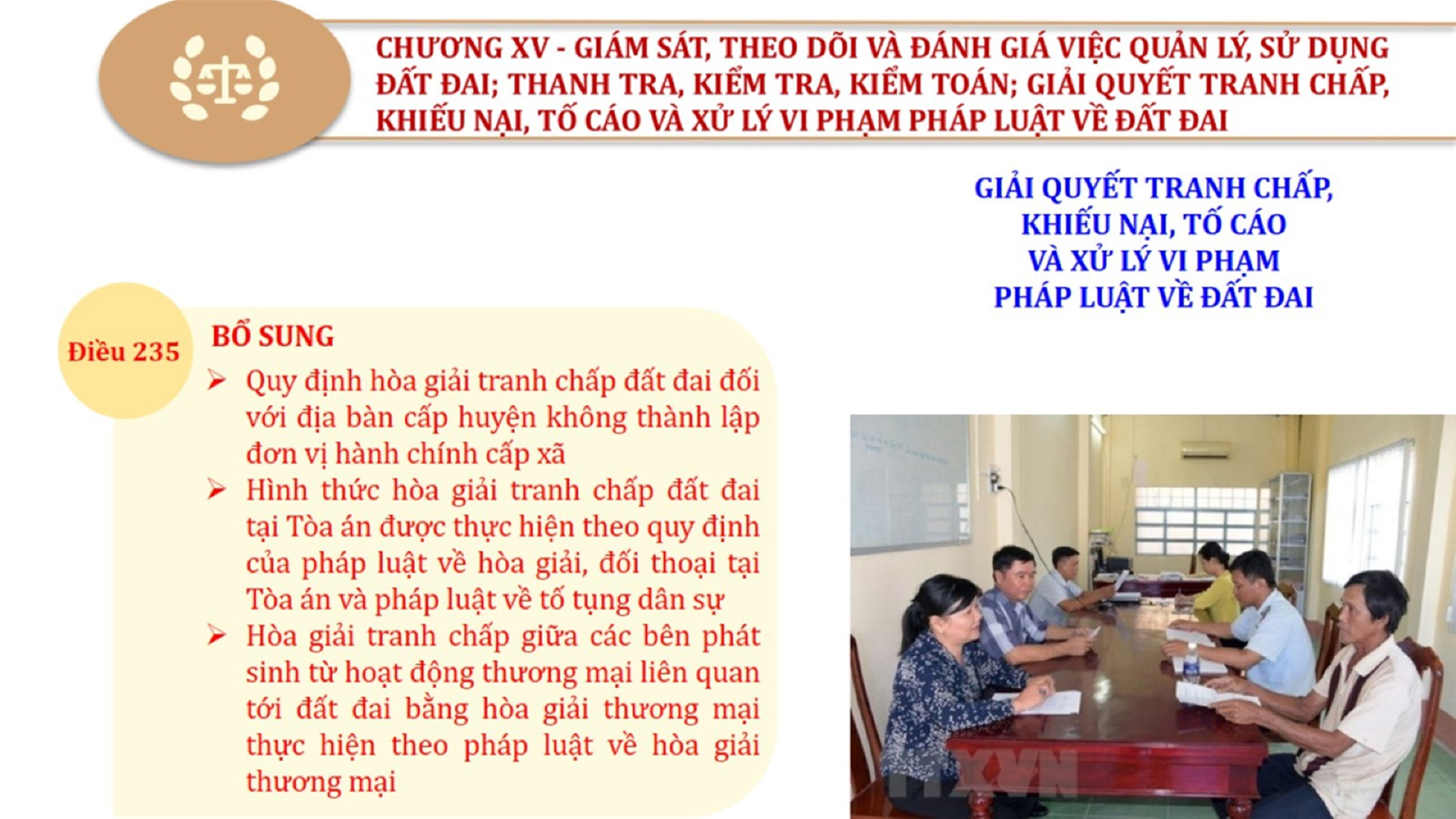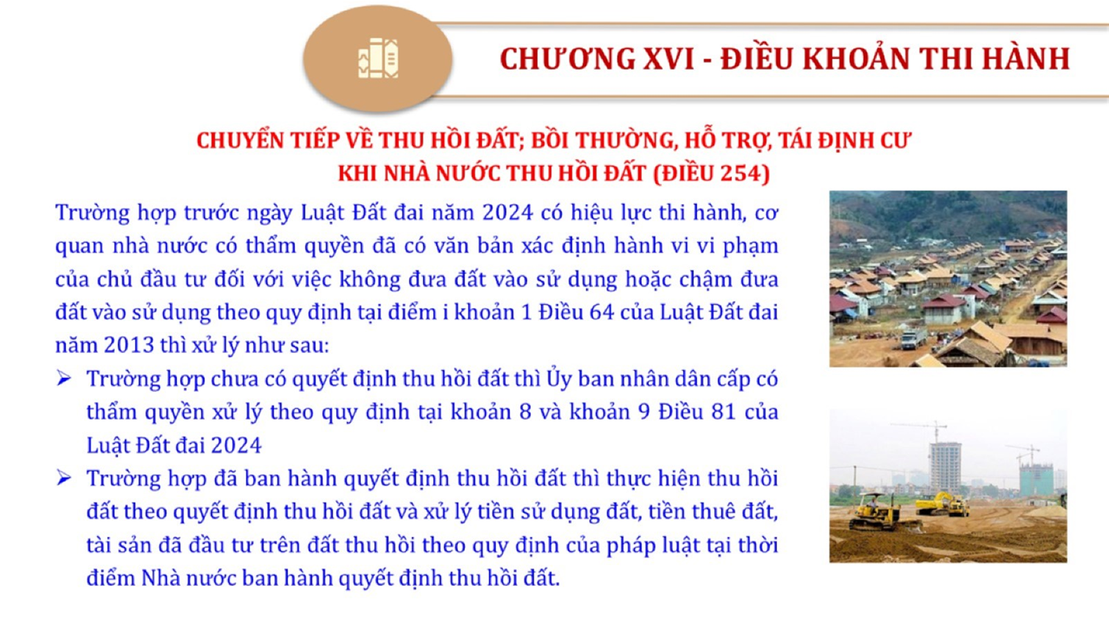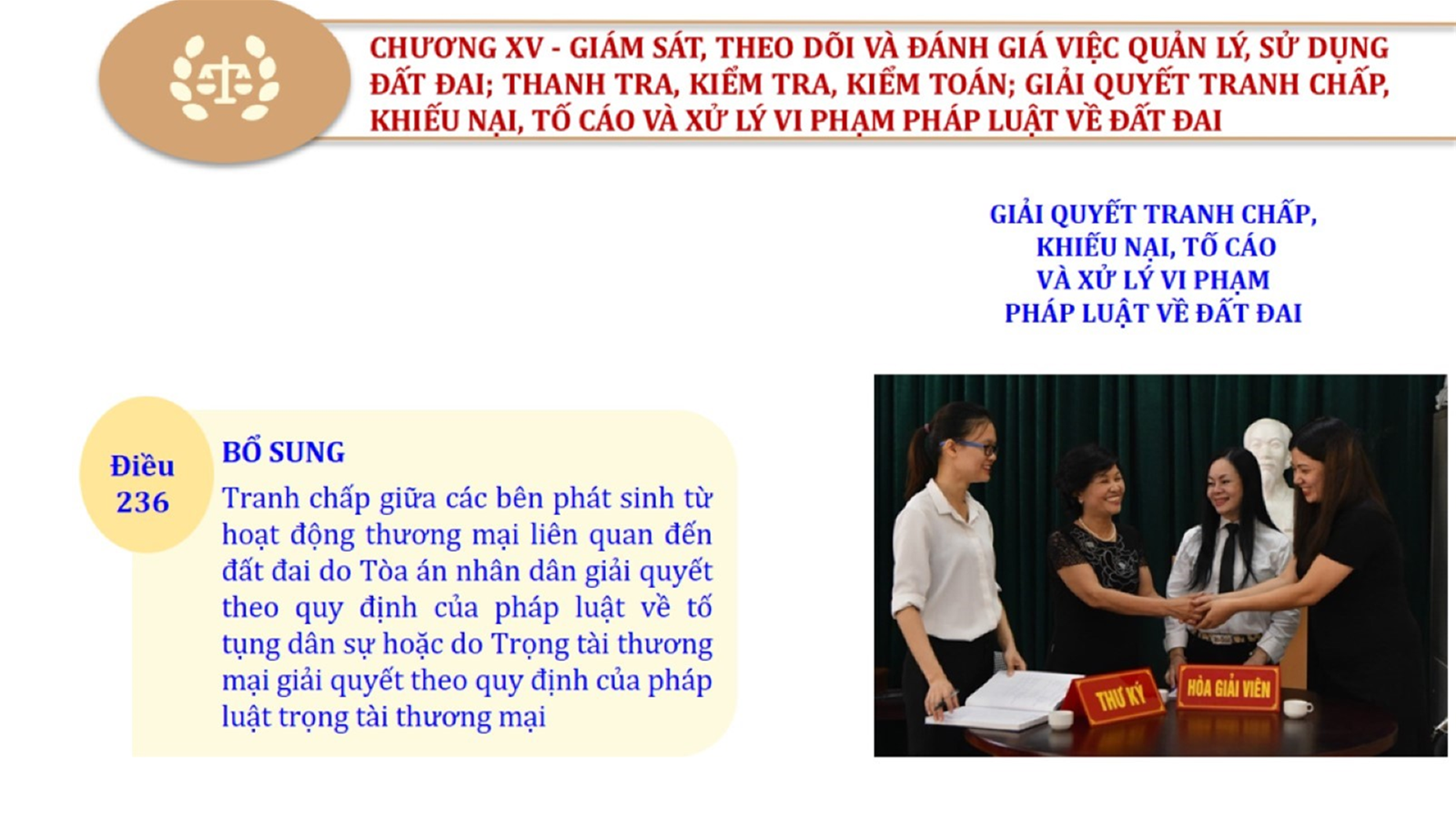 Từ lịch sử xây dựng và hoàn thiện Luật Đất đai từ năm 1998 đến năm 2024, Luật Đất đai đã trải qua 09 lần sửa đổi và bổ sung; Cơ sở xây dựng Luật Đất đai năm 2024 với hai cơ sơ chính là cơ sở chính trị và có sở thực tiễn; Quan điểm xây dựng Luật Đất đai năm 2024 với 06 nội dung lớn. Cụ thể: Một là, thể chế hóa đầy đủ, kịp thời các quan điểm, chủ trương của Đảng tại Nghị quyết Đại hội lần thứ XIII của Đảng, Nghị quyết số 18-NQ/TW và các nghị quyết, kết luận của Đảng về quản lý và sử dụng đất đai; hai là, đảm bảo kế thừa, ổn định, phát triển của hệ thống pháp luật đất đai; sửa đổi, bổ sung các quy định chưa phù hợp với thực tiễn; ba là, đảm bảo đồng bộ, thống nhất của hệ thống pháp luật về đất đai với các pháp luật có liên quan; hoàn thiện các chế định để quản lý đất đai theo chức năng là tài nguyên, tài sản, nguồn lực cả về diện tích, chất lượng, không gian sử dụng; bốn là tiếp tục đẩy mạnh phân cấp, phân quyền đồng thời thiết lập công cụ kiểm soát quyền lực của cơ quan và người có thẩm quyền trong quản lý đất đai. Tăng cường vai trò giám sát của Quốc hội, Hội đồng nhân dân, Mặt trận Tổ quốc Việt Nam, tổ chức chính trị - xã hội các cấp và Nhân dân; năm là, đẩy mạnh cải cách thủ tục hành chính; chuyển trọng tâm từ quản lý bằng các công cụ hành chính sang sử dụng hiệu quả các công cụ kinh tế để thúc đẩy sử dụng đất hợp lý, hiệu quả, bền vững; sáu là, hiện đại hóa, chuyển đổi số công tác quản lý đất đai dựa trên hệ thống thông tin, dữ liệu đất đai thống nhất, tập trung, phục vụ đa mục tiêu kết nối từ Trung ương đến địa phương, quản lý biến động đến từng thửa đất.
