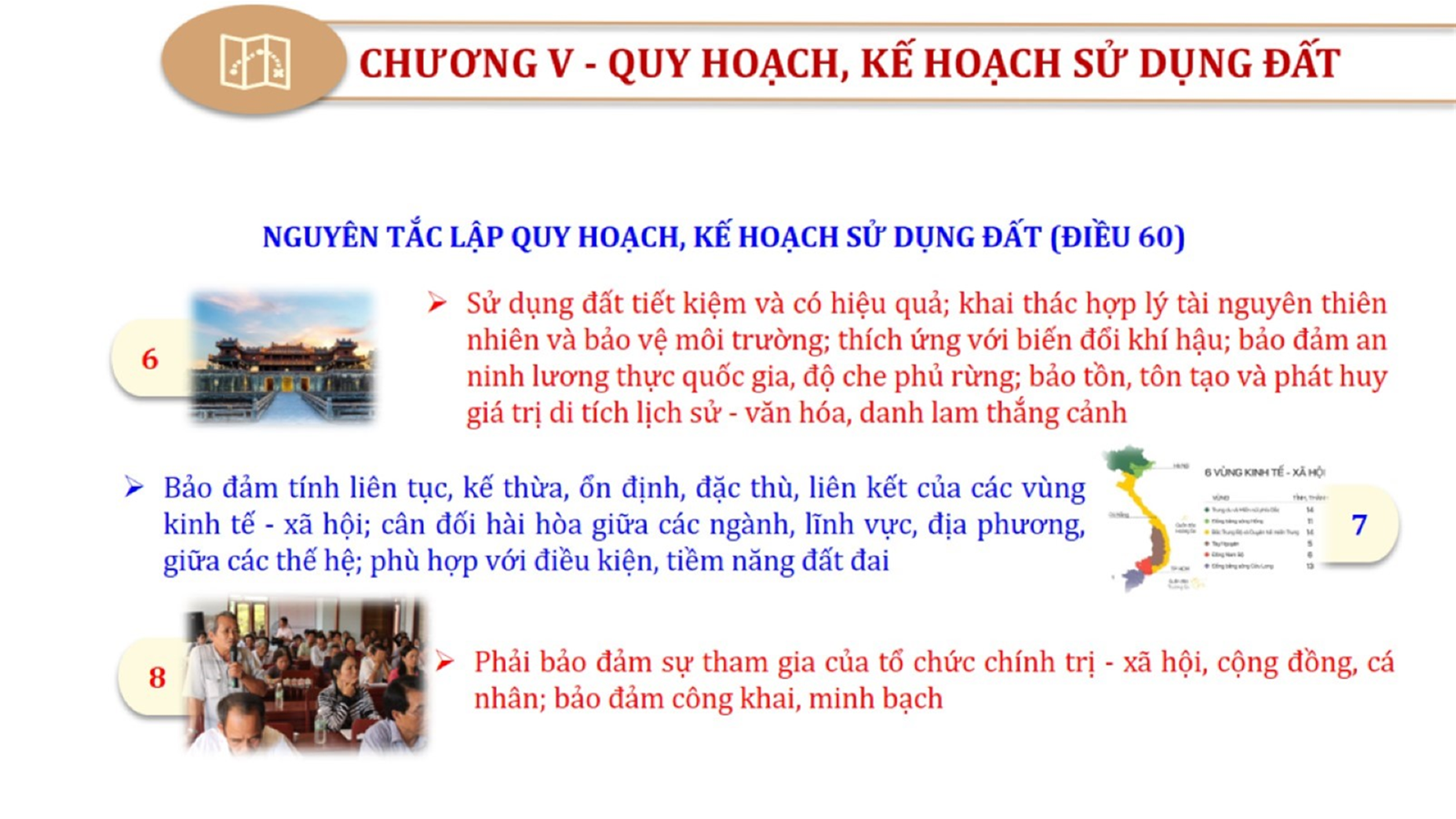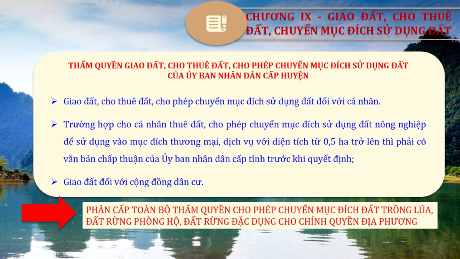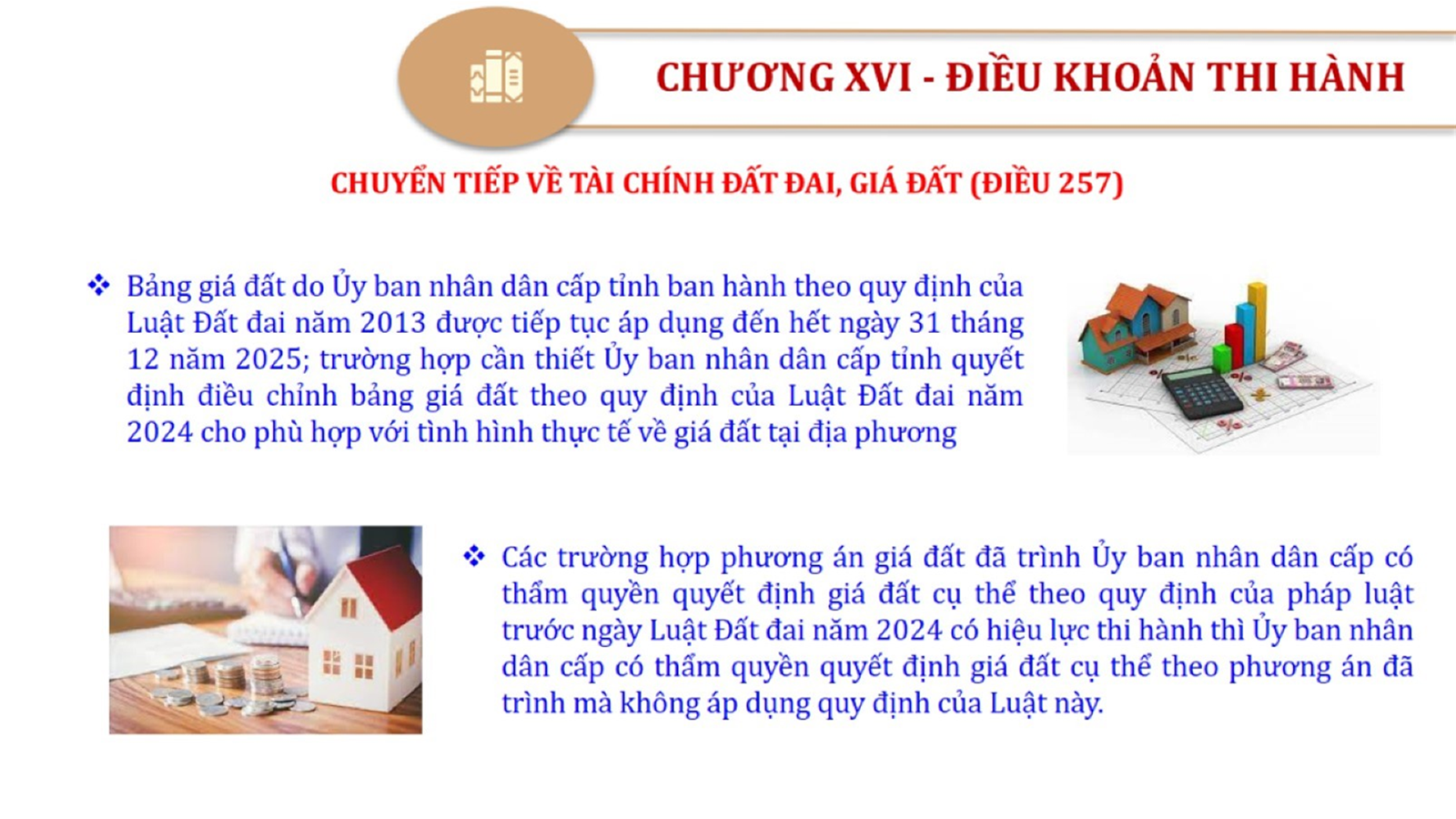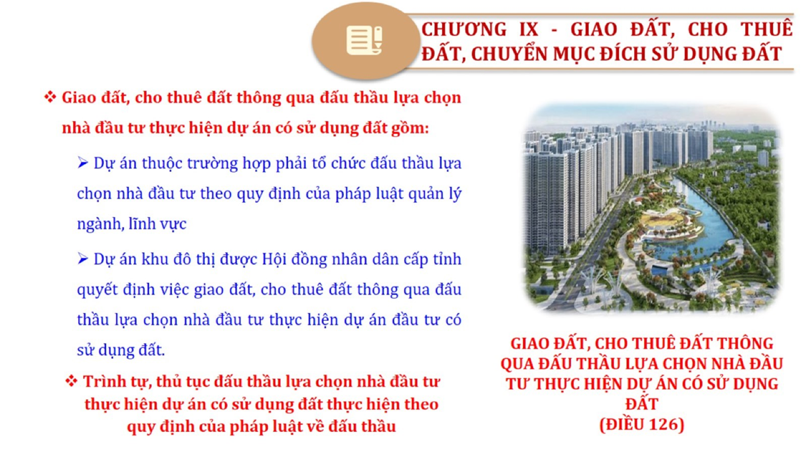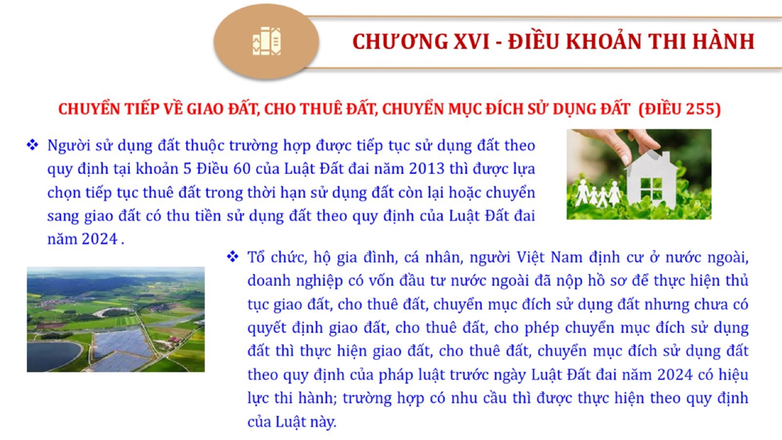 Từ lịch sử xây dựng và hoàn thiện Luật Đất đai từ năm 1998 đến năm 2024, Luật Đất đai đã trải qua 09 lần sửa đổi và bổ sung; Cơ sở xây dựng Luật Đất đai năm 2024 với hai cơ sơ chính là cơ sở chính trị và có sở thực tiễn; Quan điểm xây dựng Luật Đất đai năm 2024 với 06 nội dung lớn. Cụ thể: Một là, thể chế hóa đầy đủ, kịp thời các quan điểm, chủ trương của Đảng tại Nghị quyết Đại hội lần thứ XIII của Đảng, Nghị quyết số 18-NQ/TW và các nghị quyết, kết luận của Đảng về quản lý và sử dụng đất đai; hai là, đảm bảo kế thừa, ổn định, phát triển của hệ thống pháp luật đất đai; sửa đổi, bổ sung các quy định chưa phù hợp với thực tiễn; ba là, đảm bảo đồng bộ, thống nhất của hệ thống pháp luật về đất đai với các pháp luật có liên quan; hoàn thiện các chế định để quản lý đất đai theo chức năng là tài nguyên, tài sản, nguồn lực cả về diện tích, chất lượng, không gian sử dụng; bốn là tiếp tục đẩy mạnh phân cấp, phân quyền đồng thời thiết lập công cụ kiểm soát quyền lực của cơ quan và người có thẩm quyền trong quản lý đất đai. Tăng cường vai trò giám sát của Quốc hội, Hội đồng nhân dân, Mặt trận Tổ quốc Việt Nam, tổ chức chính trị - xã hội các cấp và Nhân dân; năm là, đẩy mạnh cải cách thủ tục hành chính; chuyển trọng tâm từ quản lý bằng các công cụ hành chính sang sử dụng hiệu quả các công cụ kinh tế để thúc đẩy sử dụng đất hợp lý, hiệu quả, bền vững; sáu là, hiện đại hóa, chuyển đổi số công tác quản lý đất đai dựa trên hệ thống thông tin, dữ liệu đất đai thống nhất, tập trung, phục vụ đa mục tiêu kết nối từ Trung ương đến địa phương, quản lý biến động đến từng thửa đất.