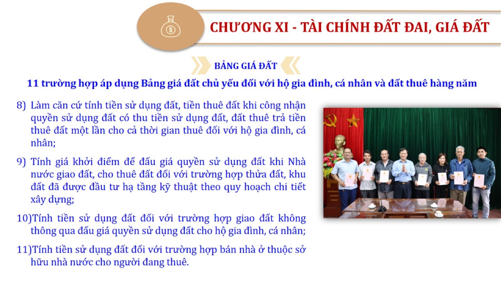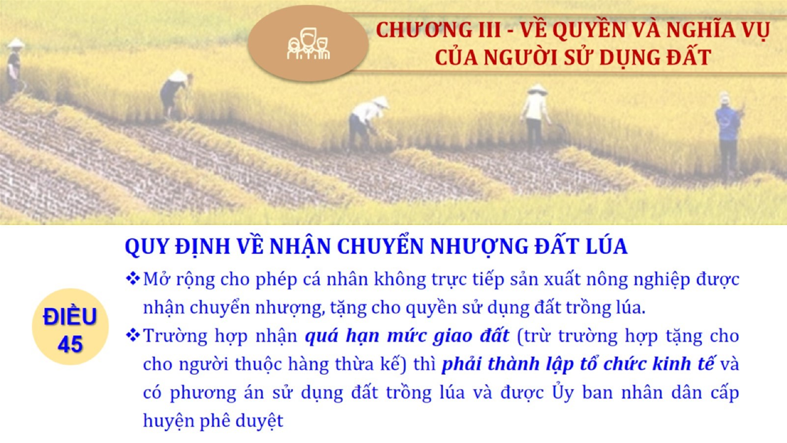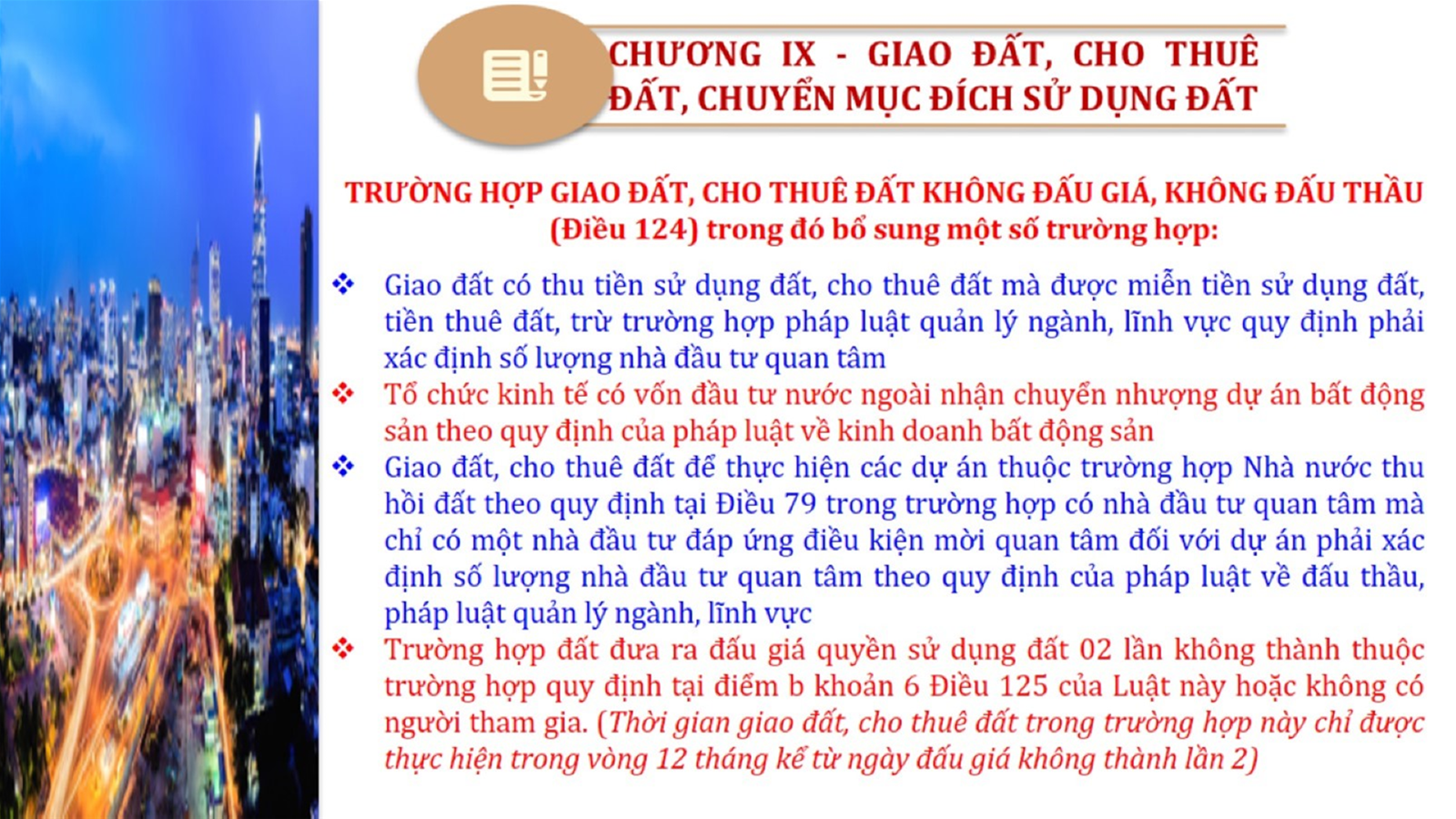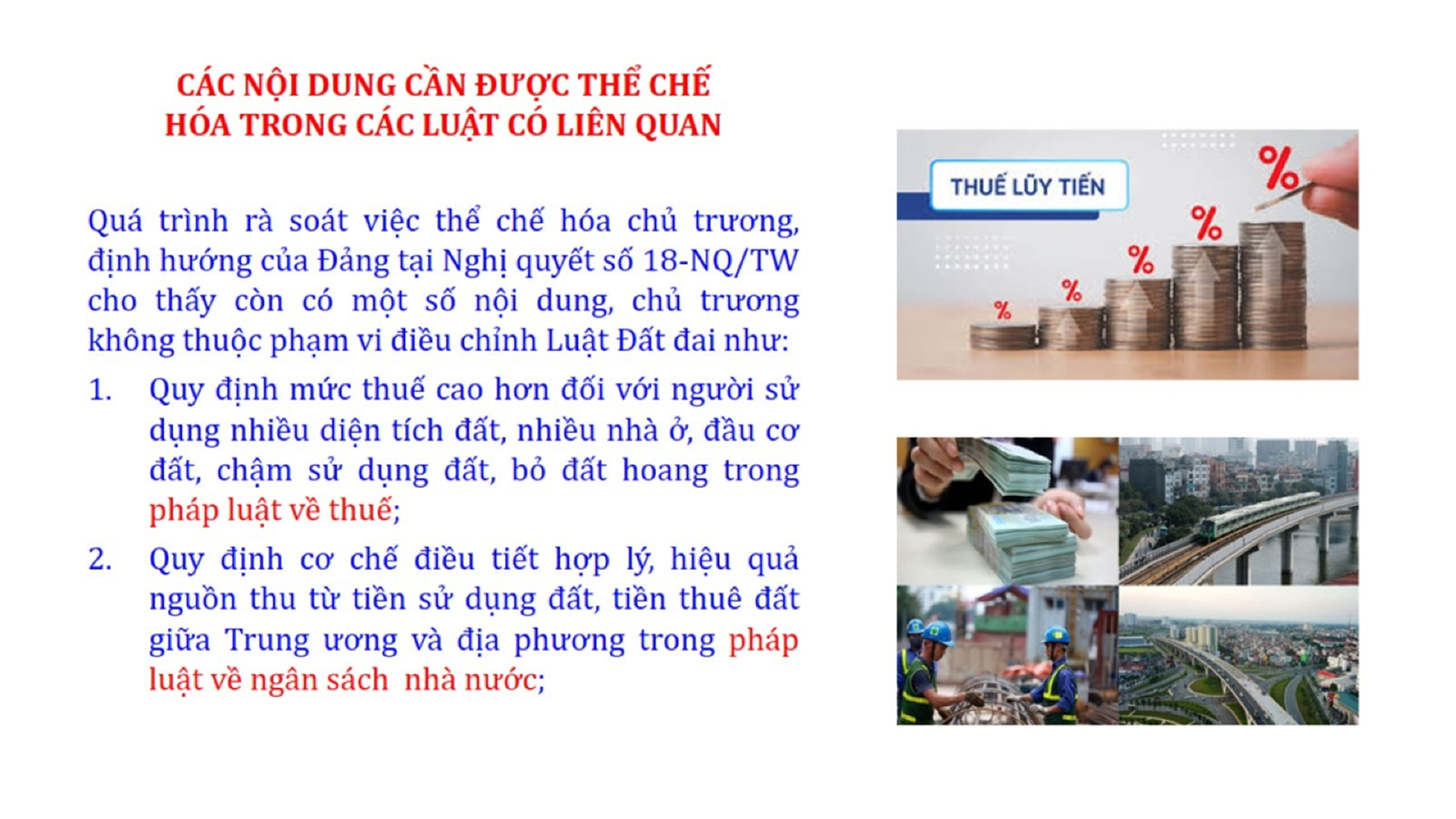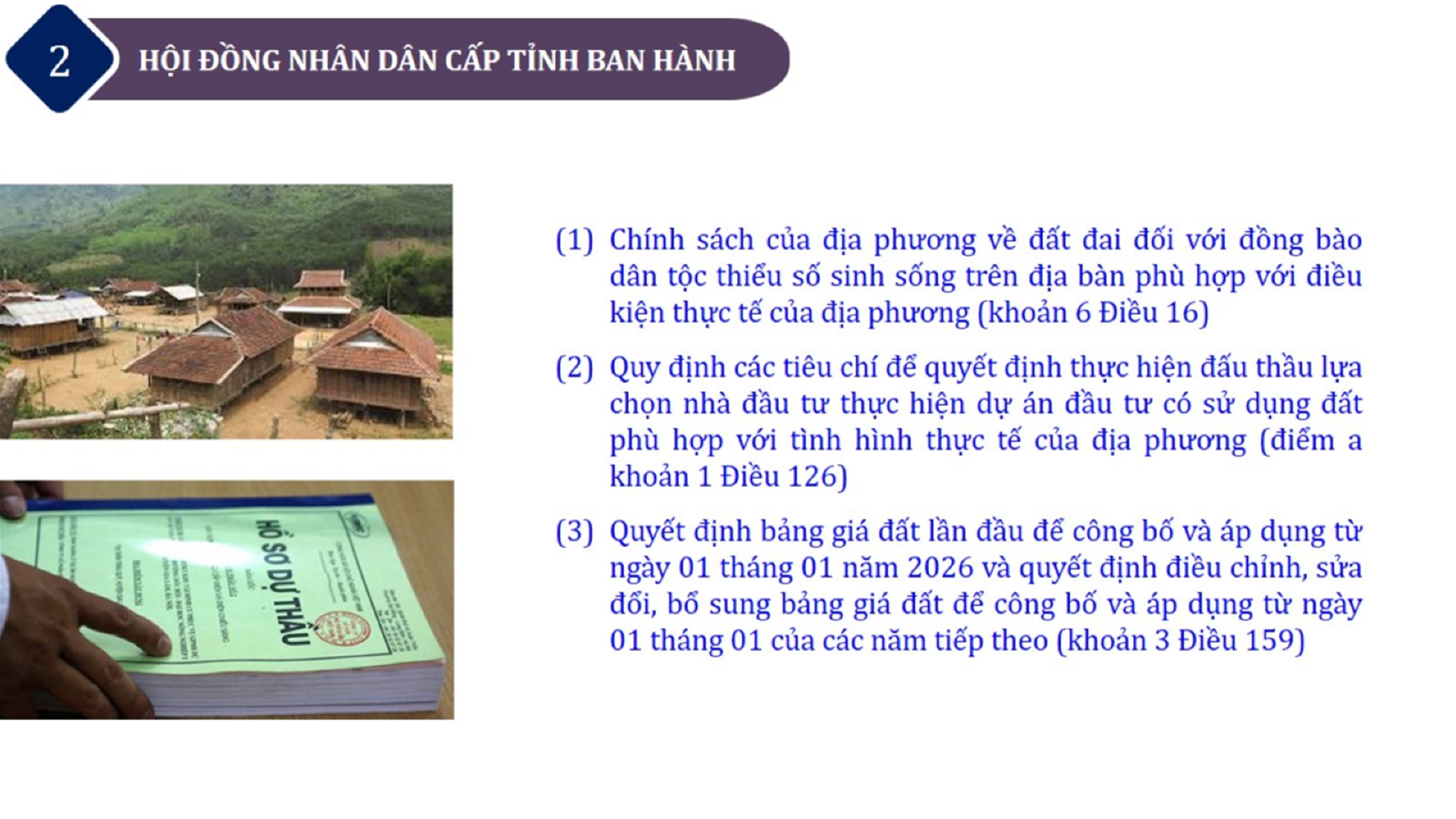 Từ lịch sử xây dựng và hoàn thiện Luật Đất đai từ năm 1998 đến năm 2024, Luật Đất đai đã trải qua 09 lần sửa đổi và bổ sung; Cơ sở xây dựng Luật Đất đai năm 2024 với hai cơ sơ chính là cơ sở chính trị và có sở thực tiễn; Quan điểm xây dựng Luật Đất đai năm 2024 với 06 nội dung lớn. Cụ thể: Một là, thể chế hóa đầy đủ, kịp thời các quan điểm, chủ trương của Đảng tại Nghị quyết Đại hội lần thứ XIII của Đảng, Nghị quyết số 18-NQ/TW và các nghị quyết, kết luận của Đảng về quản lý và sử dụng đất đai; hai là, đảm bảo kế thừa, ổn định, phát triển của hệ thống pháp luật đất đai; sửa đổi, bổ sung các quy định chưa phù hợp với thực tiễn; ba là, đảm bảo đồng bộ, thống nhất của hệ thống pháp luật về đất đai với các pháp luật có liên quan; hoàn thiện các chế định để quản lý đất đai theo chức năng là tài nguyên, tài sản, nguồn lực cả về diện tích, chất lượng, không gian sử dụng; bốn là tiếp tục đẩy mạnh phân cấp, phân quyền đồng thời thiết lập công cụ kiểm soát quyền lực của cơ quan và người có thẩm quyền trong quản lý đất đai. Tăng cường vai trò giám sát của Quốc hội, Hội đồng nhân dân, Mặt trận Tổ quốc Việt Nam, tổ chức chính trị - xã hội các cấp và Nhân dân; năm là, đẩy mạnh cải cách thủ tục hành chính; chuyển trọng tâm từ quản lý bằng các công cụ hành chính sang sử dụng hiệu quả các công cụ kinh tế để thúc đẩy sử dụng đất hợp lý, hiệu quả, bền vững; sáu là, hiện đại hóa, chuyển đổi số công tác quản lý đất đai dựa trên hệ thống thông tin, dữ liệu đất đai thống nhất, tập trung, phục vụ đa mục tiêu kết nối từ Trung ương đến địa phương, quản lý biến động đến từng thửa đất.