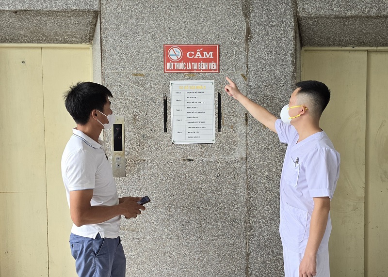 Cán bộ y tế nhắc nhở người nhà bệnh nhân không hút thuốc trong khuôn viên bệnh viện
