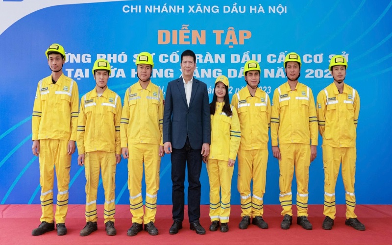Ông Phạm Văn Sơn (giữa) cùng các cộng sự trong đội ứng phó sự cố tràn dầu tại một buổi diễn tập thực tế. Những “chiến binh áo vàng” này chính là tuyến đầu thầm lặng bảo vệ môi trường trước mỗi vết dầu loang.
