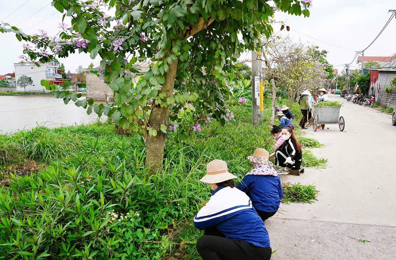 Không chỉ trồng hoa, các chị em còn tổ chức quét dọn, thu gom rác thải, phát quang bụi rậm, khơi thông cống rãnh tại tuyến đường hoa ban