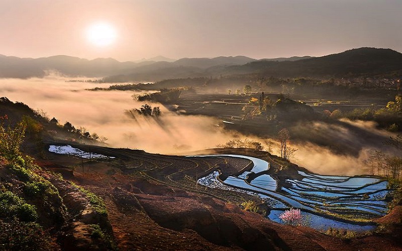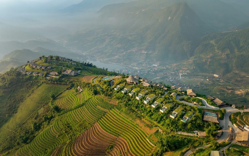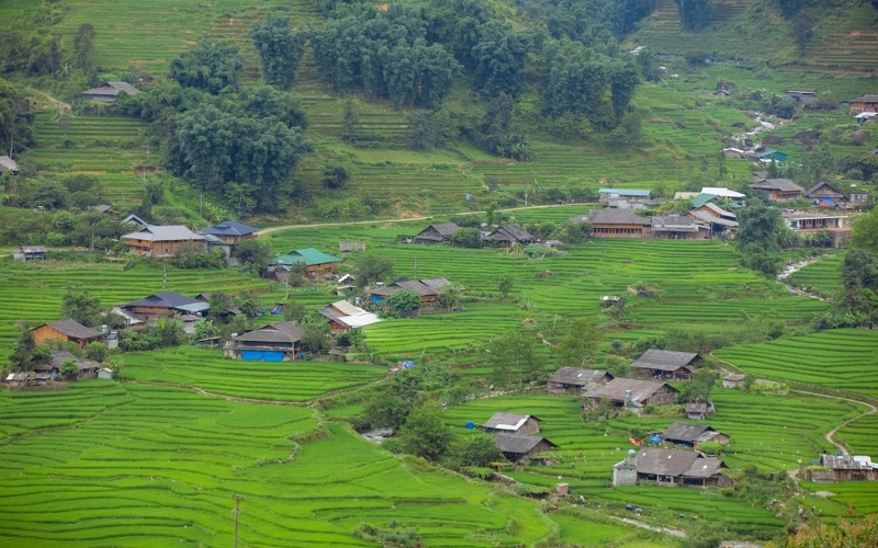 Ánh nắng đầu ngày nhẹ nhàng rót xuống các thửa ruộng bậc thang như mật ong tan chảy trên từng vạt núi. Những làn sương mỏng còn vương trên lúa non, lấp lánh như có ai đó vừa rắc bụi vàng lên từng đợt sóng xanh rì rào. Cả thung lũng bừng sáng trong vẻ đẹp nguyên sơ và thanh sạch, khi ánh mặt trời không chỉ soi rọi mặt đất mà còn đánh thức sự sống sau một đêm ngủ yên. Trong khung cảnh ấy, tiếng gà gáy, tiếng chân người rẽ lúa, tiếng cười con trẻ vọng ra từ bản nhỏ khiến bức tranh bình minh càng thêm sinh động, một vẻ đẹp vừa nên thơ, vừa đầy sức sống của vùng cao Sa Pa.