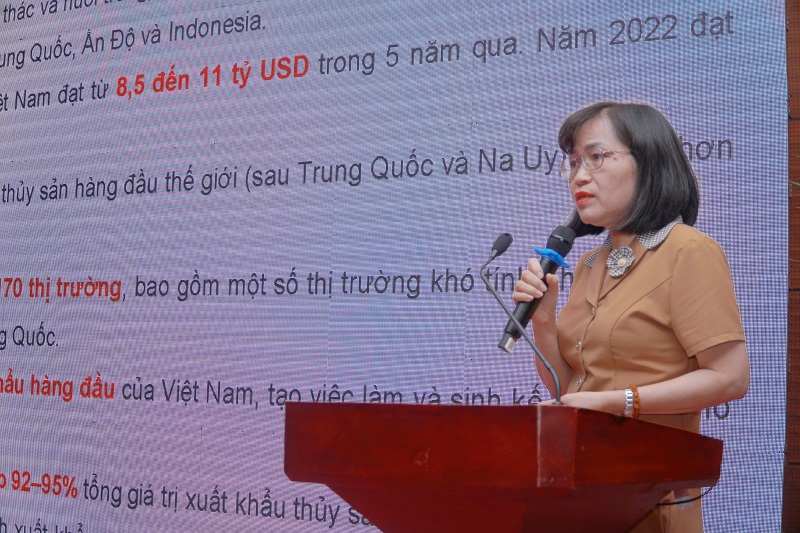 Bà Lê Hằng, Phó Tổng Thư ký Hiệp hội chế biến và xuất khẩu Thủy sản Việt Nam trình bày tham luận “Kinh tế tuần hoàn, giải pháp cho sự phát triển bền vững ngành Thủy sản”