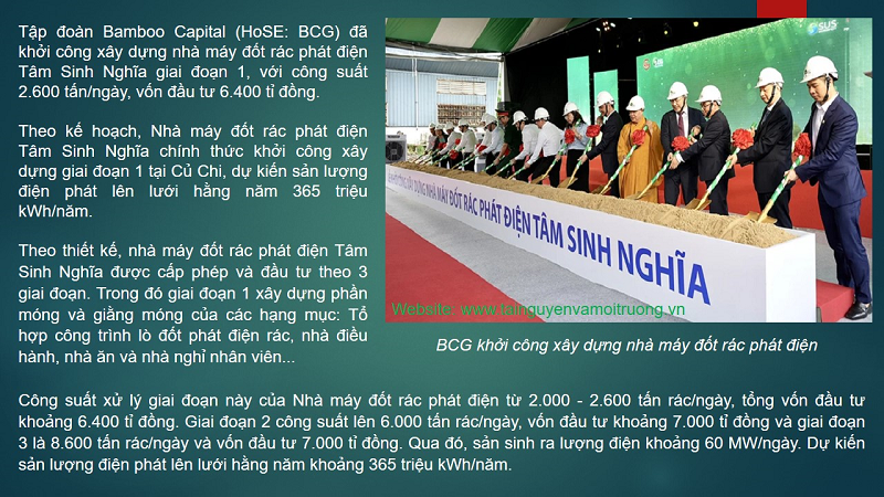 Ngày 20/7, tại TP.Hồ Chí Minh, Tập đoàn Bamboo Capital (HoSE: BCG) đã khởi công xây dựng nhà máy đốt rác phát điện Tâm Sinh Nghĩa giai đoạn 1, với công suất 2.600 tấn/ngày, vốn đầu tư 6.400 tỉ đồng. Theo thiết kế, nhà máy đốt rác phát điện Tâm Sinh Nghĩa được cấp phép và đầu tư theo 3 giai đoạn.
