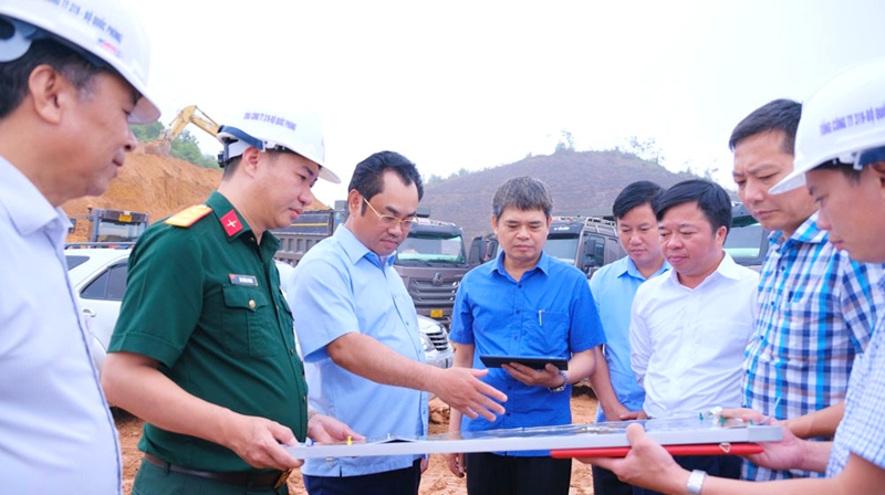 Chủ tịch UBND tỉnh Thái Nguyên Trịnh Việt Hùng (thứ 3 từ trái sang) kiểm tra tiến độ giải phóng mặt bằng và thi công Dự án Tuyến đường liên kết các tỉnh Thái Nguyên, Bắc Giang và Vĩnh Phúc, đoạn qua TP. Phổ Yên