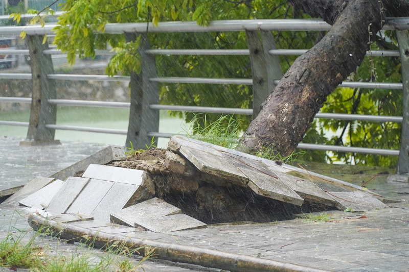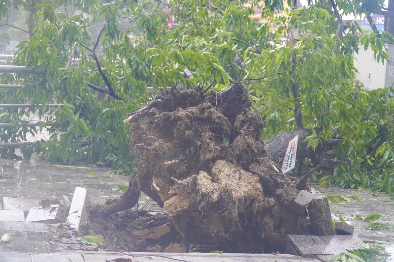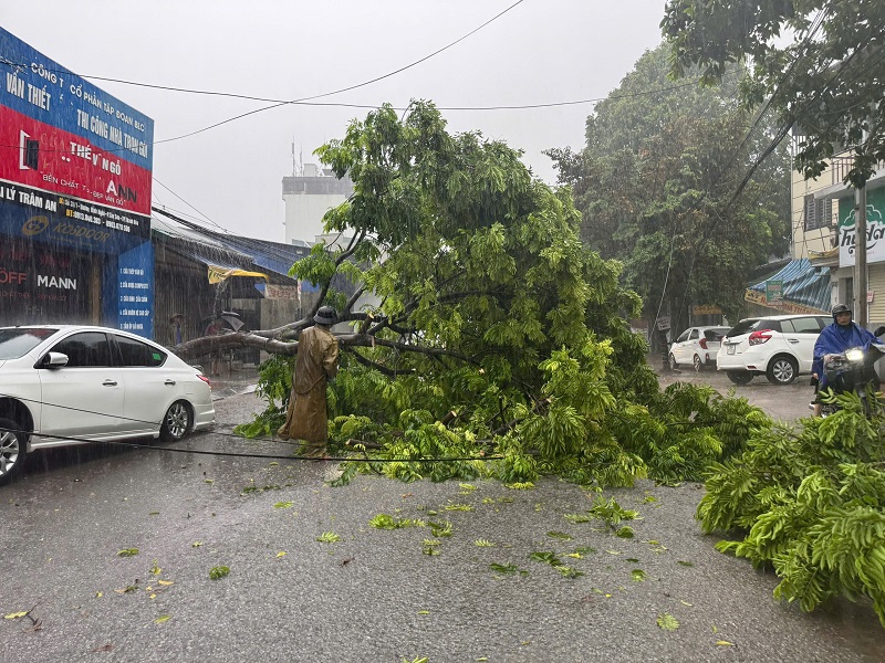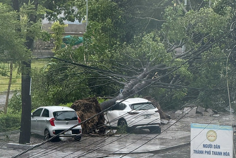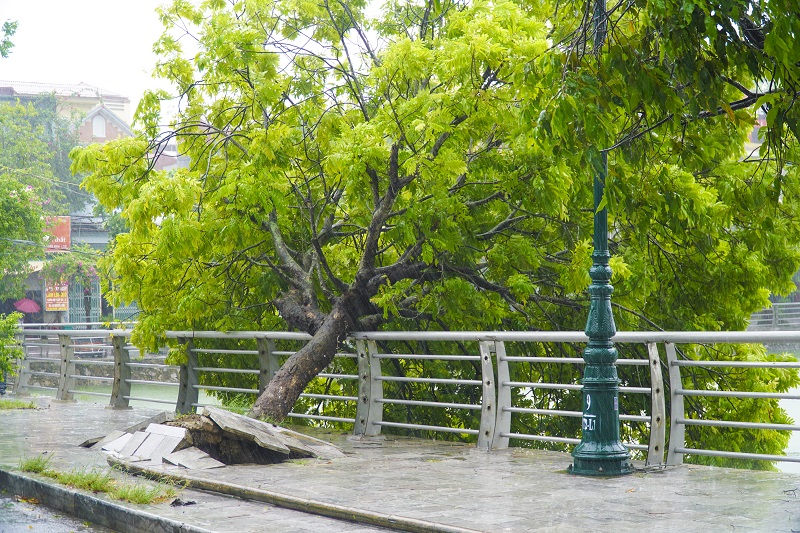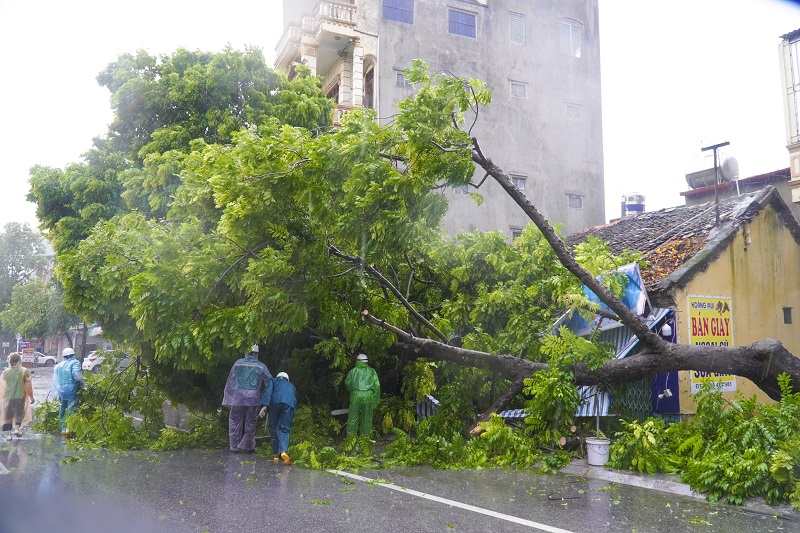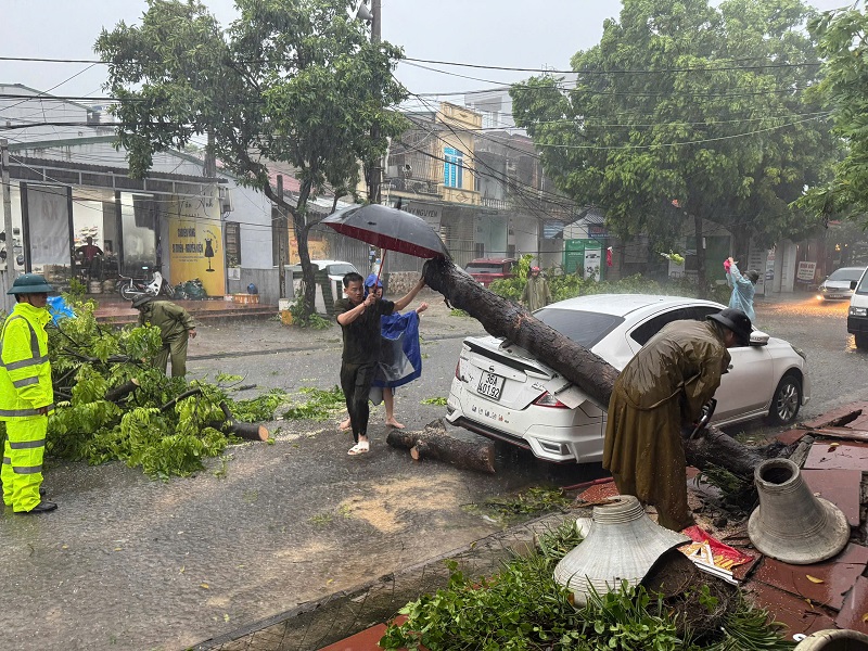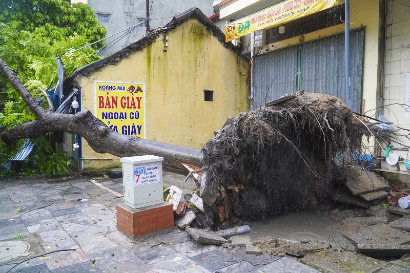 Không chỉ gây ngập úng, mưa lớn kèm theo gió giật mạnh còn làm bật gốc nhiều cây xanh lâu năm như xà cừ, bằng lăng, ngã đổ chắn ngang lòng đường, cản trở phương tiện lưu thông. Lực lượng chức năng phường Hạc Thành đã nhanh chóng có mặt tại các điểm xảy ra sự cố để phân luồng, cắt tỉa, di dời cây gãy đổ.