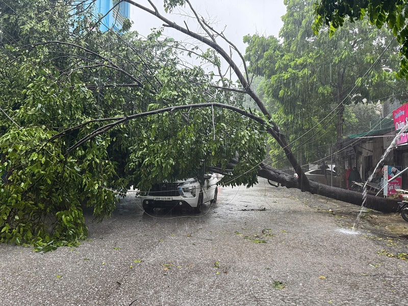 Cây xanh gãy đổ đè lên một số ô tô gây hư hỏng