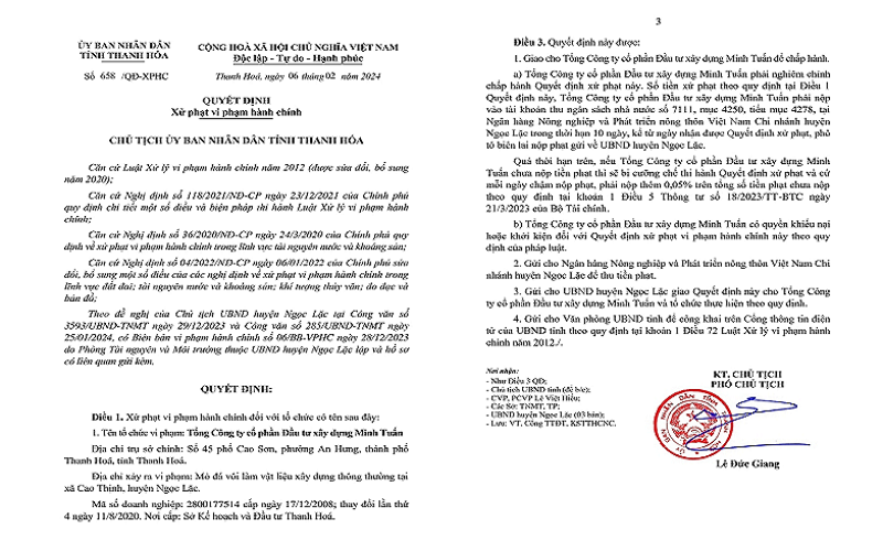 Ngày 06/02/2024 Phó chủ tịch UBND tỉnh Thanh Hóa, Lê Đức Giang vừa ký ban hành Quyết định số 658/QĐ – XPHC về việc xử phạt vi phạm hành chính đối với Tổng Công ty CP Đầu tư xây dựng Minh Tuấn (Công ty Minh Tuấn), có địa tại số 45 phố Cao Sơn, phường An Hưng, TP. Thanh Hoá, tỉnh Thanh Hoá.