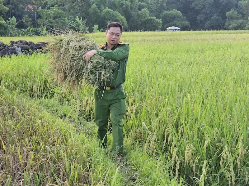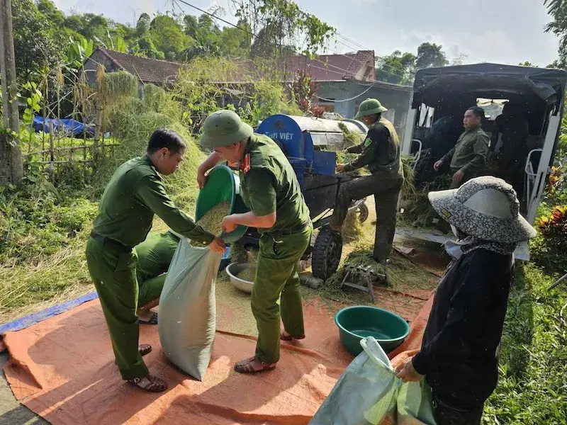 Lực lượng công an xã Điền Lư, tỉnh Thanh Hóa ra quân hỗ trợ người dân thôn Cò Lượn thu hoạch lúa tránh bão