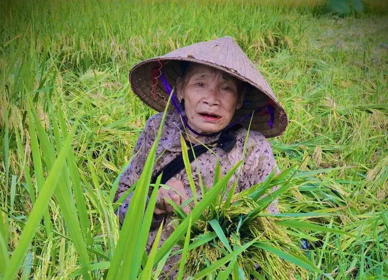Trên cánh đồng lúa vẫn còn xanh, lẫn trong màu áo xanh của lực công an nhân dân, chúng tôi nhìn thấy một bà cụ đang miệt mài nâng những khóm lúa bị gió quật đổ cắt thành từng bó. Đó là bà Trương Thị Bảy (75 tuổi), ở thôn Cò Lượn, xã Điền Lư, tỉnh Thanh Hóa.