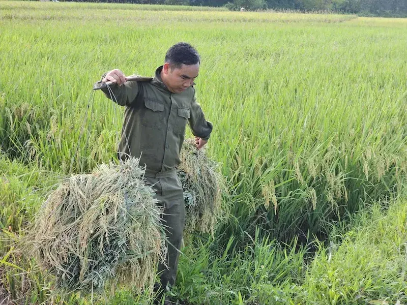 Đang vui vẻ vác những bó lúa to trên vai, mồ hôi nhễ nhại, Trung úy Hà Ngọc Lâm chia sẻ, thôn Cò Lượn thường chịu ảnh hưởng lớn từ những cơn gió mạnh khi có bão, gây thiệt hại cho đồng lúa và hoa màu nếu không kịp thu hoạch.