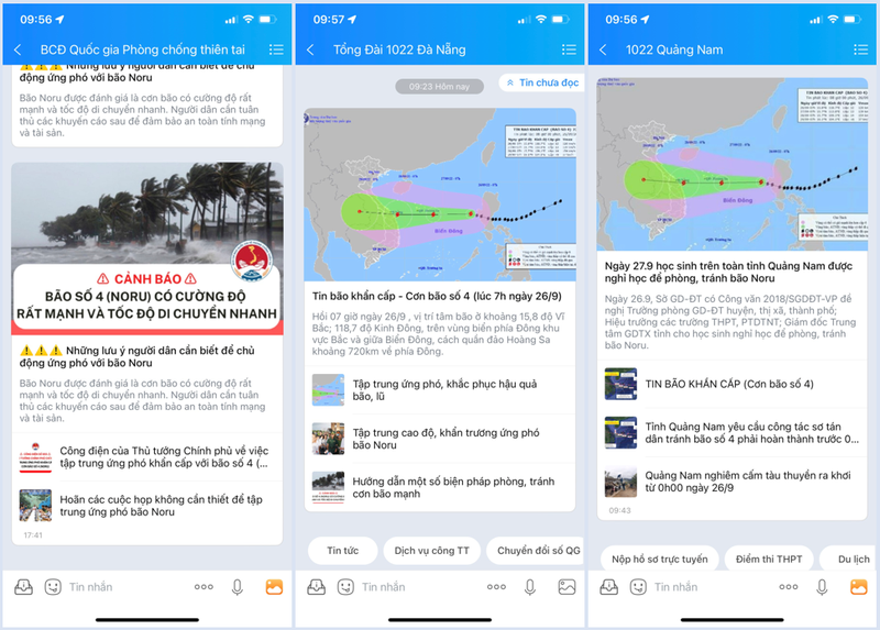 Cụ thể, một số tỉnh, thành phố như Đà Nẵng, Bình Định, Quảng Nam, Thừa Thiên Huế đã thông qua các trang Zalo chính thức như: Zalo “Tổng Đài 1022 Đà Nẵng”, Zalo “1022 Quảng Nam”, Zalo “Chính quyền điện tỉnh Bình Định”, Zalo “Trung tâm HueIOC” và Zalo “BCĐ Quốc gia Phòng chống thiên tai” để cập nhật liên tục diễn biến của bão Noru, tình hình thời tiết, các khu vực sạt lở, bị ảnh hưởng nặng, công tác triển khai ứng phó cũng như khắc phụ hậu quả sau bão.