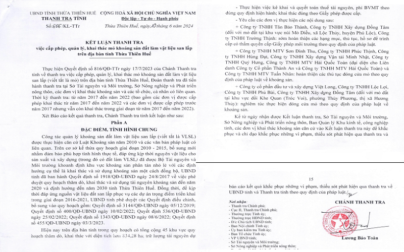 Theo đó, qua kiểm tra 28 mỏ khoáng sản, Thanh tra tỉnh Thừa Thiên - Huế kết luận có 10 mỏ được cấp Giấy phép khai thác (GPKT) không thông qua đấu giá theo quy hoạch khoanh định khu vực không đấu giá nhưng GPKT không giới hạn các công trình được phép cung cấp vật liệu đất san lấp. Có 03 mỏ được cấp GPKT có thời hạn khai thác thực hiện dự án lớn hơn thời hạn cho phép thực hiện dự. Có 01 mỏ tại khu vực đồi Kiền Kiền, xã Phong Thu, huyện Phong Điền cấp GPKT cho Công ty cổ phần và đầu tư xây dựng Việt Long, tuy nhiên GPKT chưa đúng mẫu theo quy định. Có 02 mỏ được cấp gia hạn GPKT nhưng chưa bảo đảm về thời gian theo quy định. Có 03 mỏ được cấp gia hạn GPKT nhưng tại thời điểm cấp phép gia hạn đơn vị chưa thực hiện thủ tục thuê đất và chưa thực hiện các nghĩa vụ của người sử dụng đất. Có 03 mỏ được cấp gia hạn GPKT nhưng trữ lượng cho phép khai thác không trùng với trữ lượng tính tiền cấp quyền khai thác.