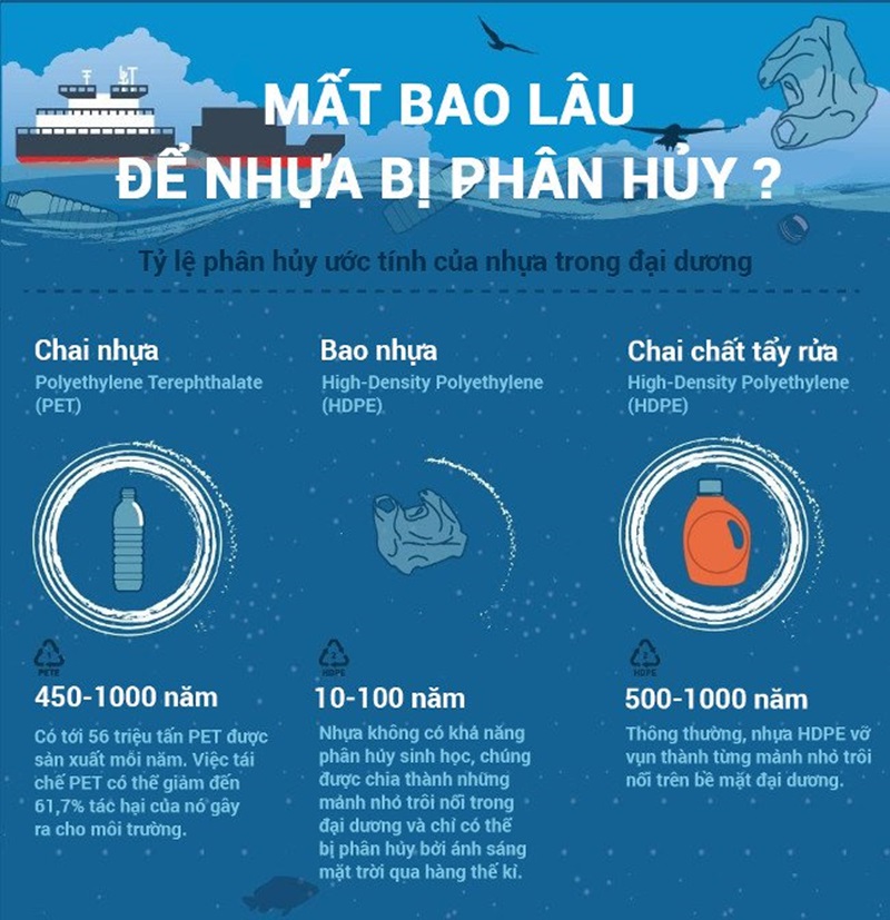Theo đánh giá của Liên Hợp quốc, trong 50 năm qua, lượng nhựa được tiêu dùng đã tăng gấp 20 lần và dự kiến sẽ tăng gấp đôi trong 20 năm tới. Tuy nhiên, loại chất dẻo này có đặc tính khó phân hủy. Một chiếc túi ni lông, nhiều khi được sử dụng trong 5 phút, chỉ mất 5 giây để sản xuất và cần 1 giây để vứt bỏ, song để phân hủy thì cần từ 500-1.000 năm.