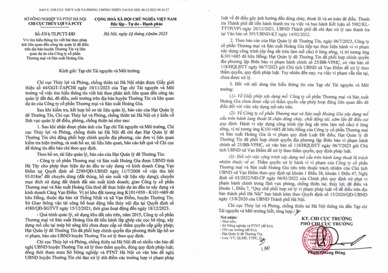 Sau khi có bài viết của Tạp chí, ngày 08/12/2023, Chi cục Thủy lợi và Phòng, chống thiên tai Hà Nội đã có Văn bản số 2354/TLPCTT-ĐĐ chỉ đạo Hạt Quản lý đê Thường Tín chủ động phối hợp chính quyền địa phương, các đơn vị kiểm tra liên quan đến vi phạm của Công ty Hoàng Gia.