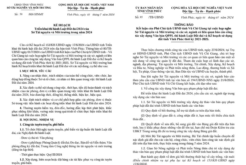 Theo đó, các Sở, ban, ngành, UBND các huyện, thành phố trên địa bàn tỉnh Vĩnh Phúc đã ban hành kế hoạch triển khai thi hành Luật Đất đai 2024. Đơn cử, Sở Tài nguyên và Môi trường tỉnh Vĩnh Phúc đã ban hành Kế hoạch số 50/KH-STNMT, ngày 3/7/2024 về việc triển khai thi hành Luật Đất đai 2024;