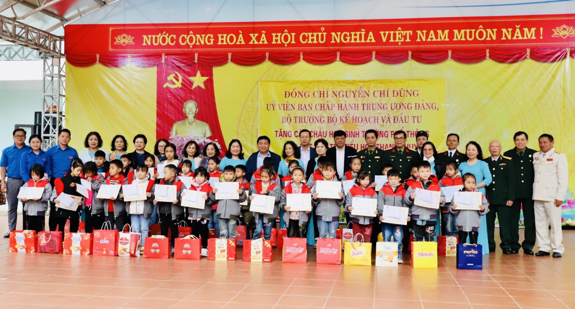 Tại đây, Bộ trưởng Nguyễn Chí Dũng cũng tặng 10 con trâu cho 10 gia đình chính sách tại địa phương, tổng trị giá 200 triệu đồng; cùng 34 phần quà, áo ấm cho các em học sinh. Bộ trưởng mong muốn từ những con trâu được tặng, các gia đình sẽ vượt khó, vươn lên thoát nghèo, góp phần phát triển kinh tế địa phương.