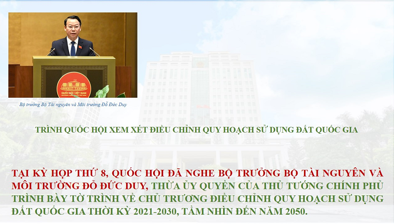 Bộ trưởng Bộ Tài nguyên và Môi trường Đỗ Đức Duy nêu rõ: Chính phủ trình Quốc hội quyết định chủ trương điều chỉnh Quy hoạch sử dụng đất quốc gia tại Kỳ họp thứ 8, Quốc hội khóa XV là rất cần thiết để Chính phủ có đủ thời gian tổ chức lập, thẩm định, trình Quốc hội xem xét, thông qua vào kỳ họp thường lệ cuối năm 2025, đáp ứng yêu cầu phát triển kinh tế - xã hội, bảo đảm quốc phòng, an ninh của đất nước.