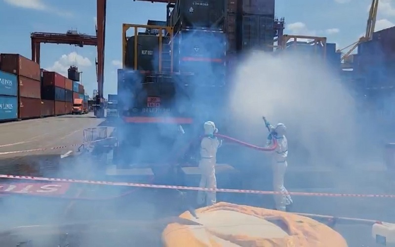 Lực lượng SOS triển khai hoạt động ứng phó sự cố cháy bồn chứa axít tại kho cảng (Ảnh: NVCC)