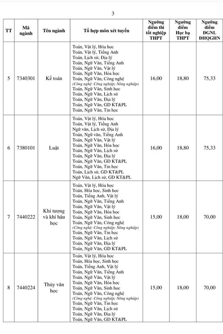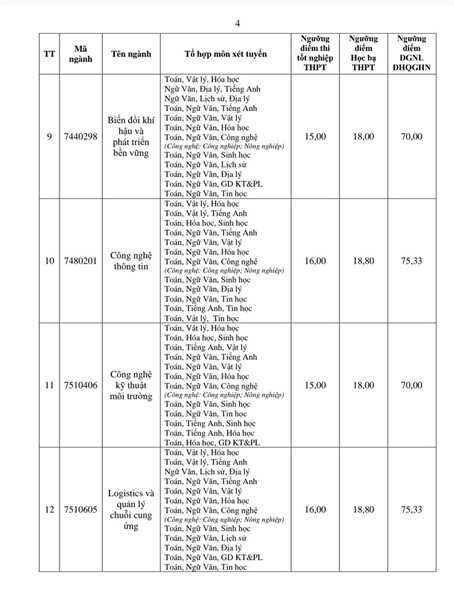 Theo đó, ngưỡng đảm bảo chất lượng đầu vào (mức điểm tối thiểu để được đăng ký xét tuyển vào ngành đào tạo) đối với phương thức xét tuyển theo kết quả thi tốt nghiệp THPT năm 2025 (là tổng điểm tổ hợp môn xét tuyển của ngành cộng với điểm ưu tiên khu vực, đối tượng trong tuyển sinh nếu có) và phương thức xét tuyển theo kết quả Học bạ THPT; kết quả thi Đánh giá năng lực của ĐHQG Hà Nội năm 2025.