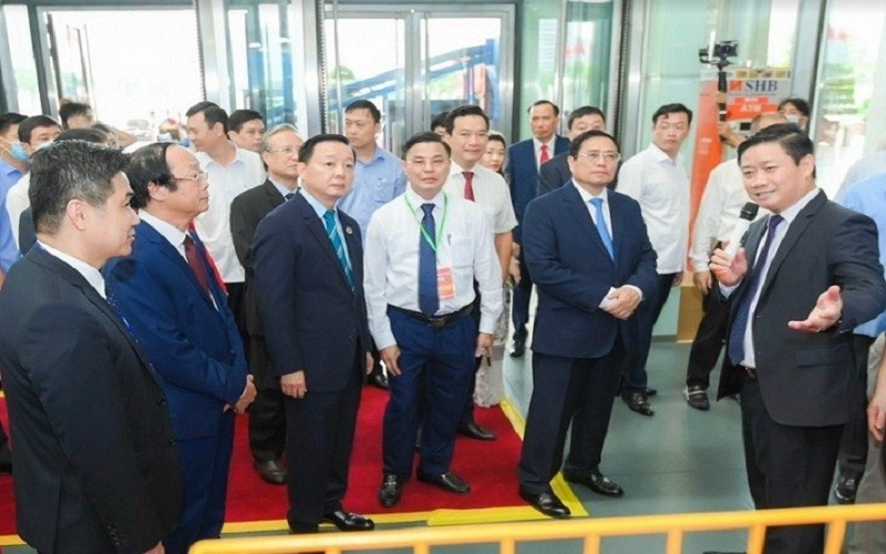 TS. Nguyễn Đình Trọng (phải) chia sẻ với Thủ tướng Phạm Minh Chính và các lãnh đạo Bộ TN&MT (cũ) về mô hình lò đốt rác phát điện "Made in VietNam" tại Hội nghị Môi trường lần thứ V