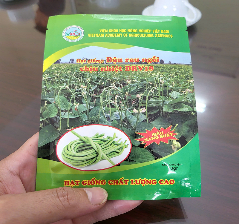 Hạt giống: Đậu rau ngồi chịu nhiệt ĐRV18, sản phẩm được đóng gói và phân phối bởi Trung tâm Nghiên cứu và Phát triển đậu đỗ