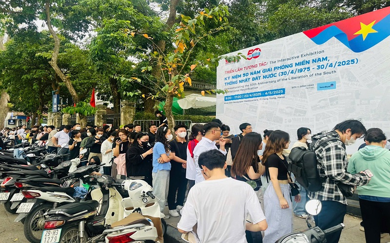 Những hàng nối dài của các bản trẻ Hà Nội chờ đến lượt để vào xem triển lãm Kỷ niệm 50 năm Giải phóng miền Nam