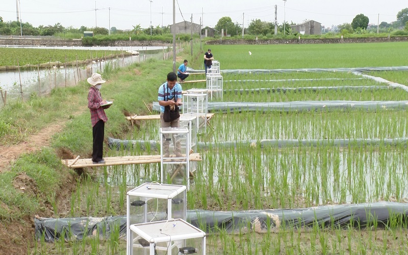 Các kỹ thuật viên và cán bộ chuyên môn tiến hành lấy mẫu khí nhà kính tại mô hình trồng lúa tưới khô – ướt xen kẽ (AWD) ở cánh đồng Khó Ngoài, xã Ứng Hòa (Hà Nội). Đây là một phần trong dự án thí điểm trồng lúa giảm phát thải gắn với tín chỉ các-bon, với kỳ vọng mở ra hướng canh tác thông minh, bền vững và mang lại thu nhập mới cho nông dân từ thị trường các-bon.