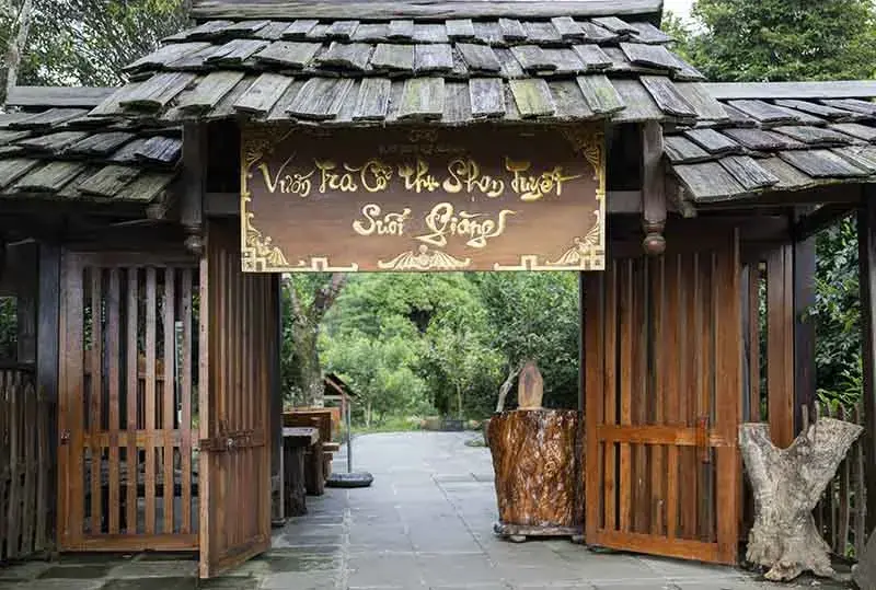 Cổng gỗ mang đậm kiến trúc vùng cao, dẫn lối vào Vườn chè Shan tuyết cổ thụ Suối Giàng, nơi lưu giữ những gốc chè hàng trăm năm tuổi và là điểm đến văn hóa đặc sắc của đồng bào Mông ở Suối Giàng