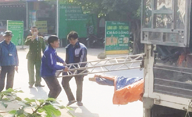 Lực lượng chức năng thu giữ các vật dụng dựng trái phép trên đất nông nghiệp tại xã Võng La (huyện Đông Anh)