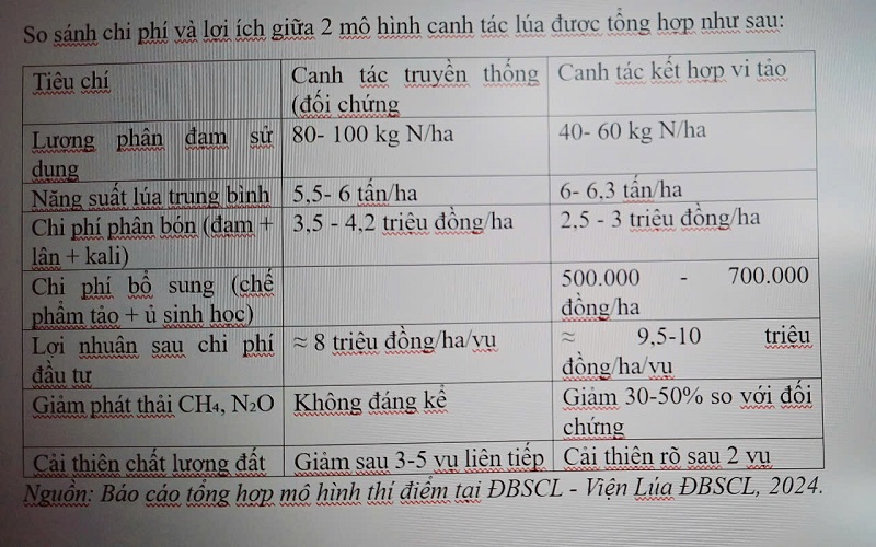 Theo nghiên cứu của Viện Khoa học Nông nghiệp Việt Nam, các mô hình lúa, vi tảo, phân hữu cơ vi sinh tại ĐBSCL đã giúp giảm đến 40- 50% lượng phân đạm sử dụng mà vẫn duy trì năng suất, thậm chí còn nâng cao chất lượng gạo do giảm tồn dư nitrat và hóa chất độc hại.