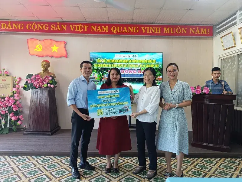 Đặc biệt, nhằm hỗ trợ cho công tác thu gom, vận chuyển rác hữu cơ sau phân loại, Dự án TVA/WWF-Việt Nam đã bàn giao cho Ban Quản lý chợ Đông Ba 5 xe rác đẩy tay mới. Đây là công cụ thiết thực giúp quá trình thu gom diễn ra thuận tiện, khoa học, đảm bảo rác hữu cơ được tập kết đúng nơi, đúng quy trình, tránh lẫn tạp chất. Những chiếc xe đẩy tay nhỏ gọn này được kỳ vọng sẽ phát huy hiệu quả ngay trong mùa cao điểm mua bán sắp tới, khi lượng rác phát sinh tại chợ thường tăng mạnh.